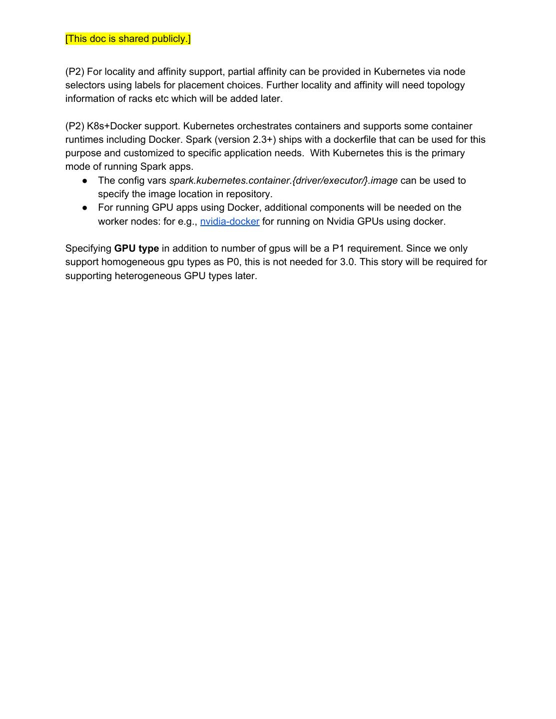 10 .[This doc is shared publicly.] (P2) For locality and affinity support, partial affinity can be provided in Kubernetes via node selectors using labels for placement choices. Further locality and affinity will need topology information of racks etc which will be added later. (P2) K8s+Docker support. Kubernetes orchestrates containers and supports some container runtimes including Docker. Spark (version 2.3+) ships with a dockerfile that can be used for this purpose and customized to specific application needs. With Kubernetes this is the primary mode of running Spark apps. ● The config vars spark.kubernetes.container.{driver/executor/}.image can be used to specify the image location in repository. ● For running GPU apps using Docker, additional components will be needed on the worker nodes: for e.g., nvidia-docker for running on Nvidia GPUs using docker. Specifying GPU type in addition to number of gpus will be a P1 requirement. Since we only support homogeneous gpu types as P0, this is not needed for 3.0. This story will be required for supporting heterogeneous GPU types later.