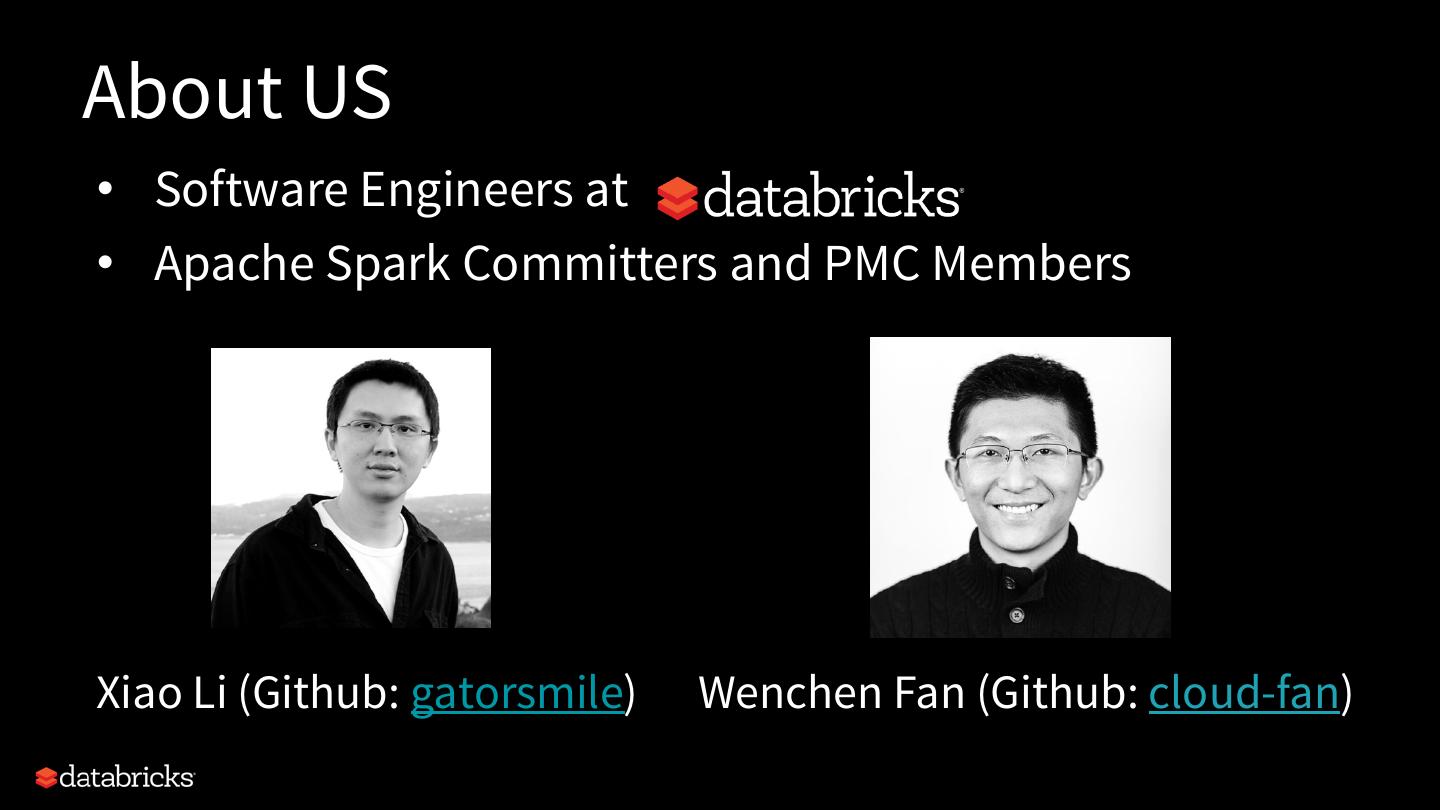 2 .About US • Software Engineers at • Apache Spark Committers and PMC Members Xiao Li (Github: gatorsmile) Wenchen Fan (Github: cloud-fan)