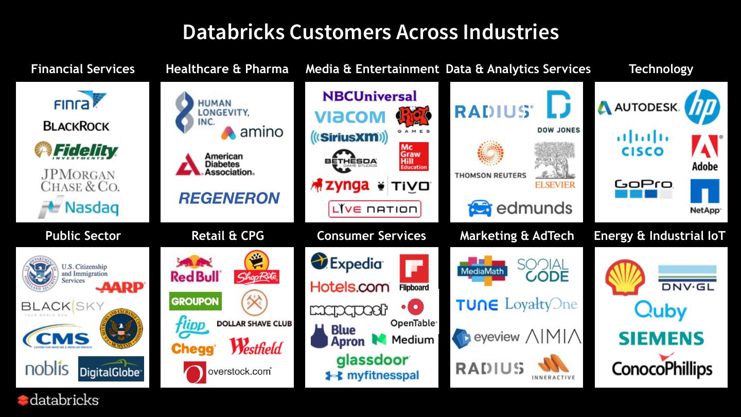 3 . Databricks Customers Across Industries Financial Services Healthcare & Pharma Media & Entertainment Data & Analytics Services Technology Public Sector Retail & CPG Consumer Services Marketing & AdTech Energy & Industrial IoT