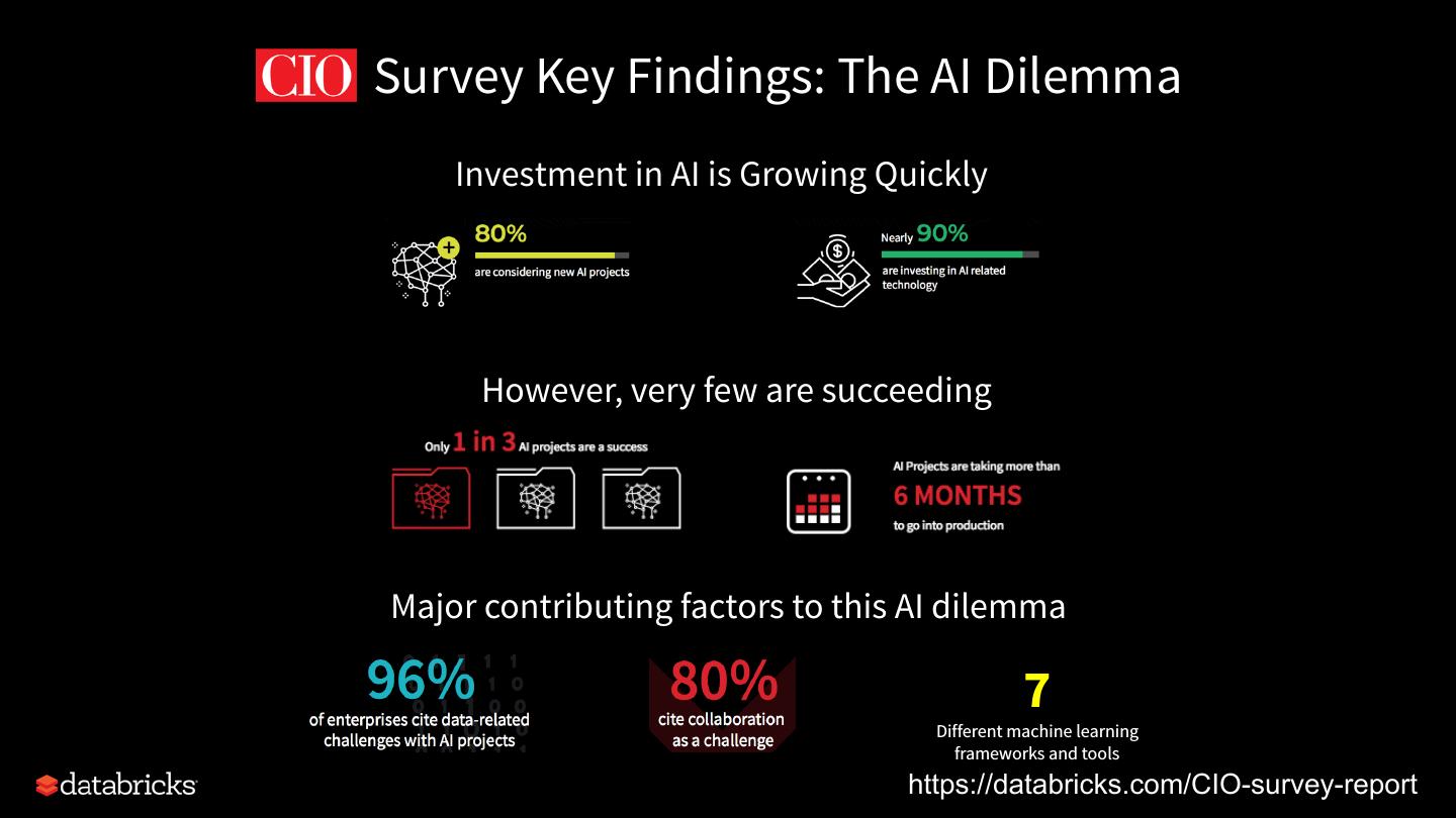 12 .Survey Key Findings: The AI Dilemma Investment in AI is Growing Quickly However, very few are succeeding Major contributing factors to this AI dilemma 7 Different machine learning frameworks and tools https://databricks.com/CIO-survey-report