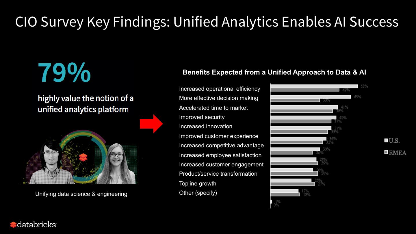 13 .CIO Survey Key Findings: Unified Analytics Enables AI Success Benefits Expected from a Unified Approach to Data & AI Increased operational efficiency More effective decision making Accelerated time to market Improved security Increased innovation Improved customer experience Increased competitive advantage Increased employee satisfaction Increased customer engagement Product/service transformation Topline growth Unifying data science & engineering Other (specify)