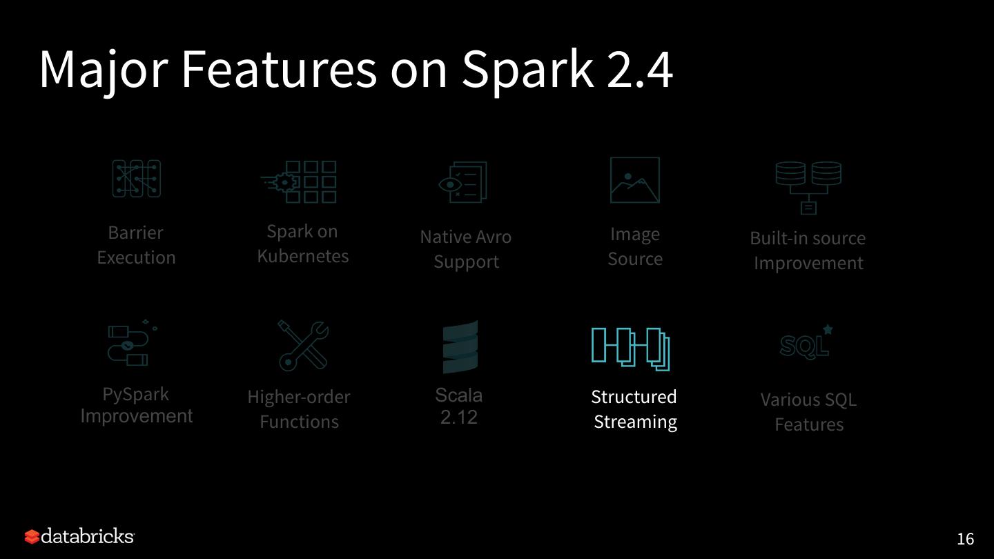 16 .Major Features on Spark 2.4 Barrier Spark on Native Avro Image Built-in source Execution Kubernetes Support Source Improvement PySpark Higher-order Scala Structured Various SQL Improvement Functions 2.12 Streaming Features 16