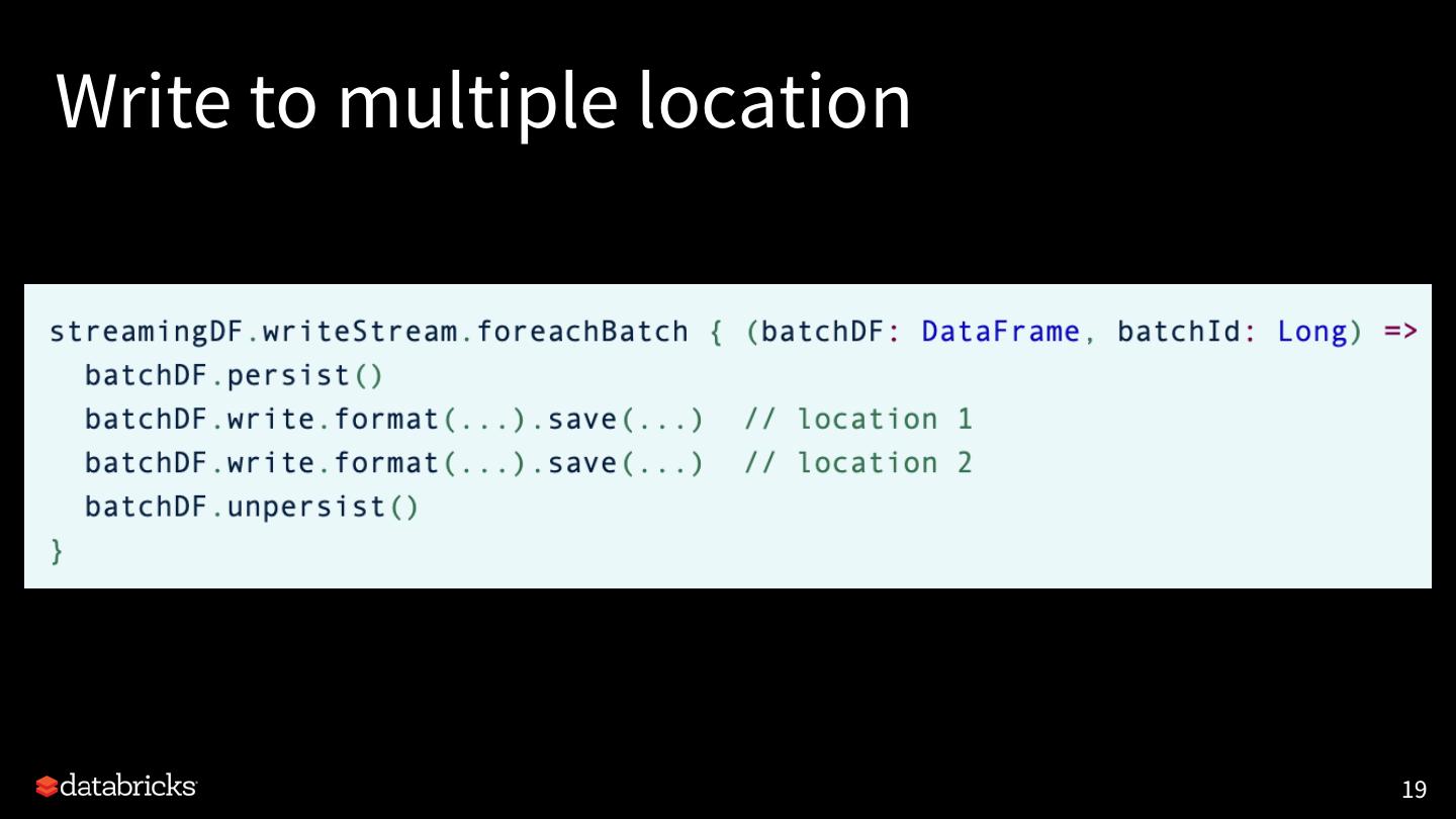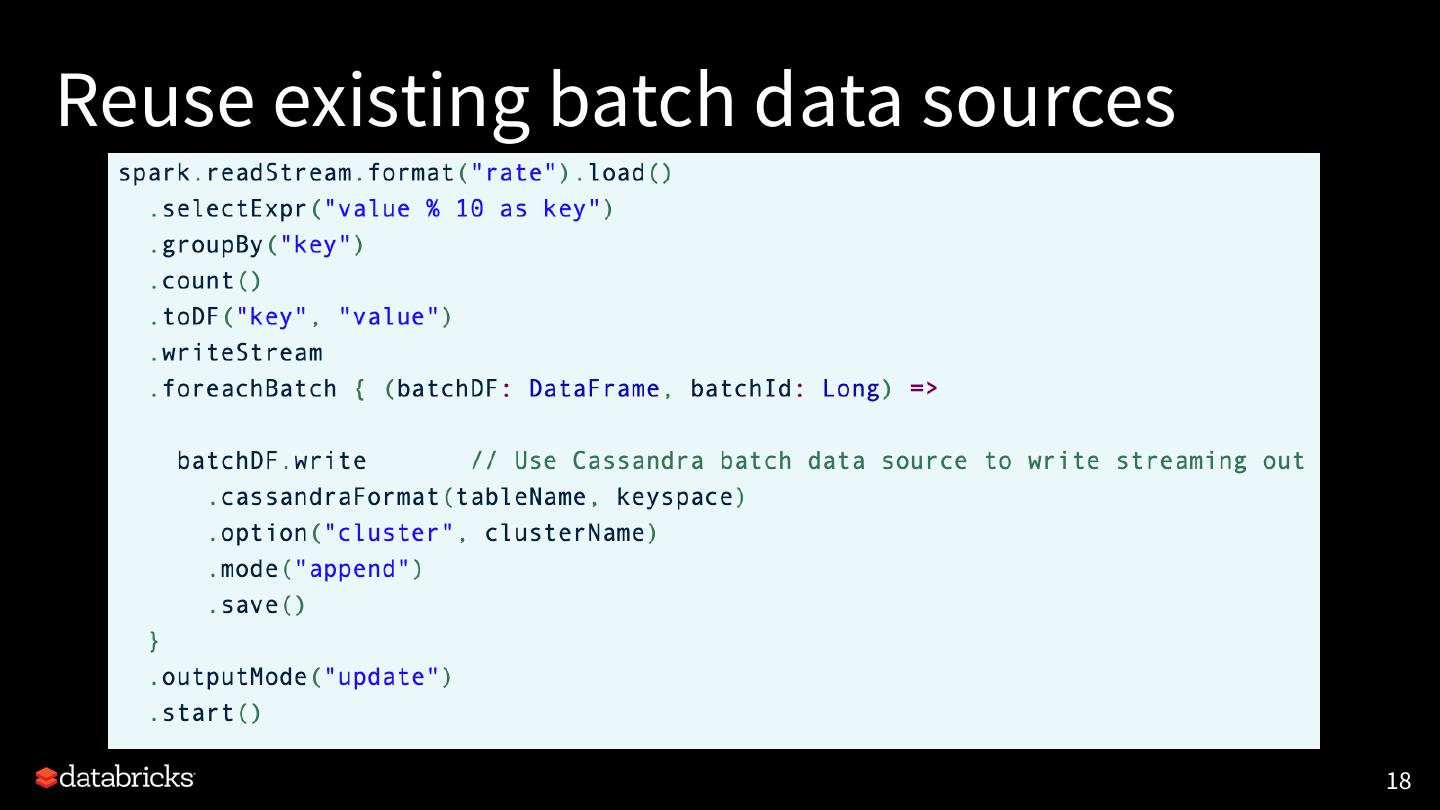 17 .Flexible Streaming Sink [SPARK-24565] Exposing output rows of each microbatch as a DataFrame foreachBatch(f: Dataset[T] => Unit) • Scala/Java/Python APIs in DataStreamWriter. • Reuse existing batch data sources • Write to multiple locations • Apply additional DataFrame operations 17