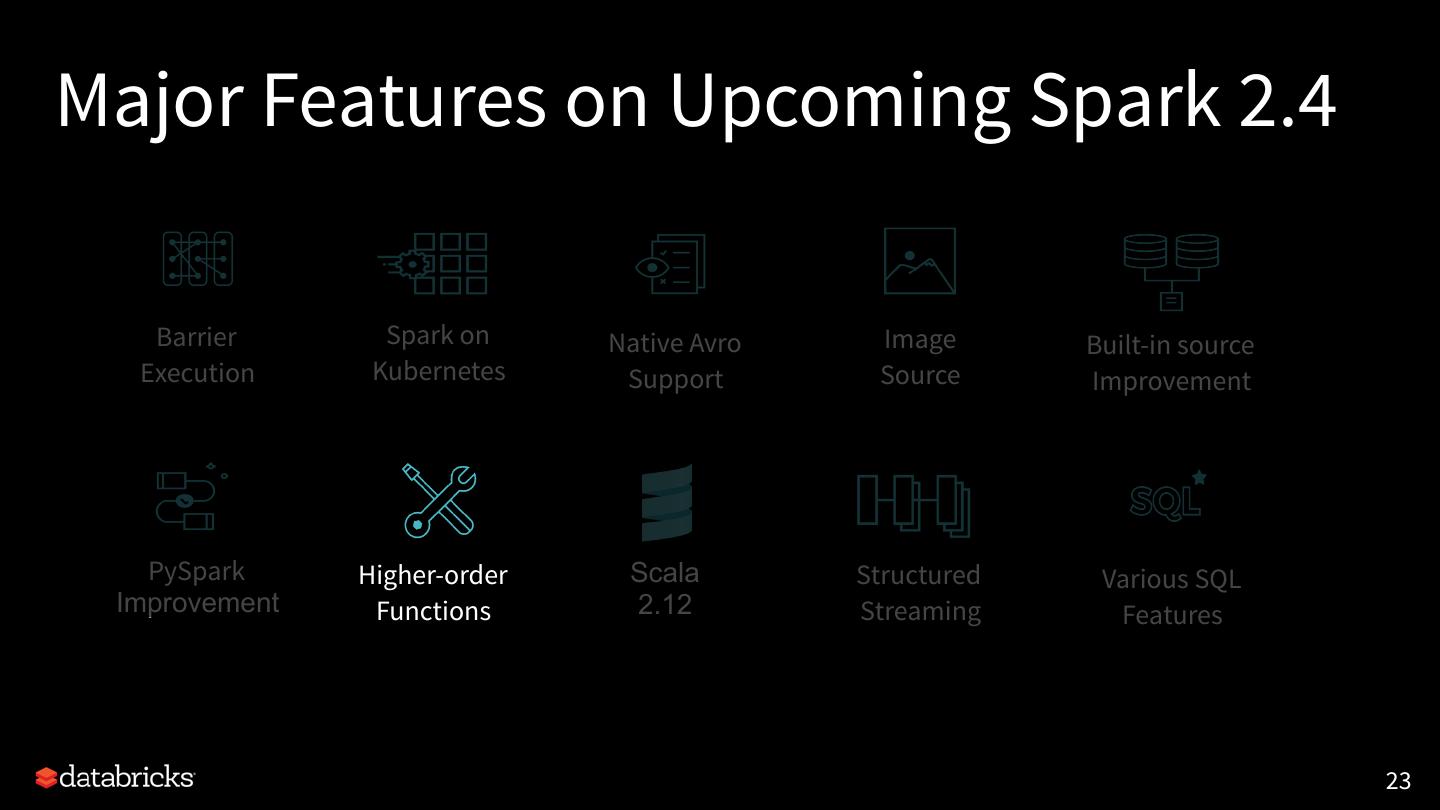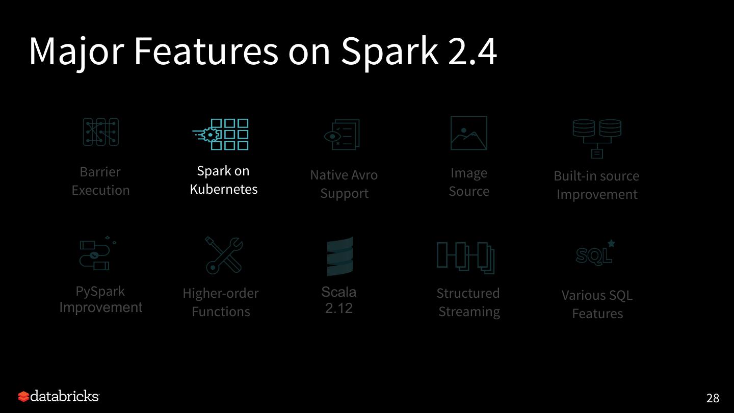 23 .Major Features on Upcoming Spark 2.4 Barrier Spark on Native Avro Image Built-in source Execution Kubernetes Support Source Improvement PySpark Higher-order Scala Structured Various SQL Improvement Functions 2.12 Streaming Features 23