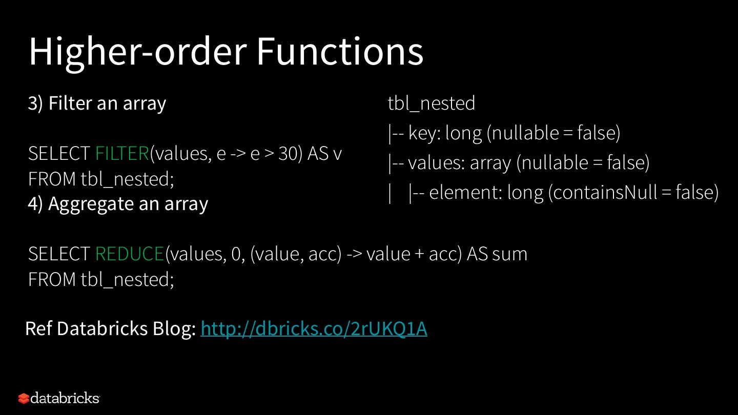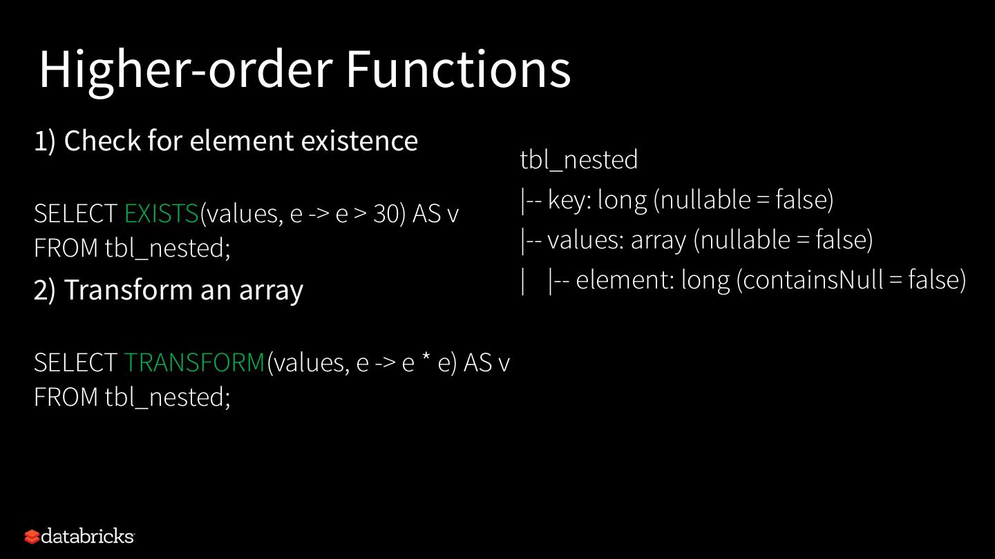 25 .Higher-order Functions 1) Check for element existence tbl_nested |-- key: long (nullable = false) SELECT EXISTS(values, e -> e > 30) AS v FROM tbl_nested; |-- values: array (nullable = false) 2) Transform an array | |-- element: long (containsNull = false) SELECT TRANSFORM(values, e -> e * e) AS v FROM tbl_nested;