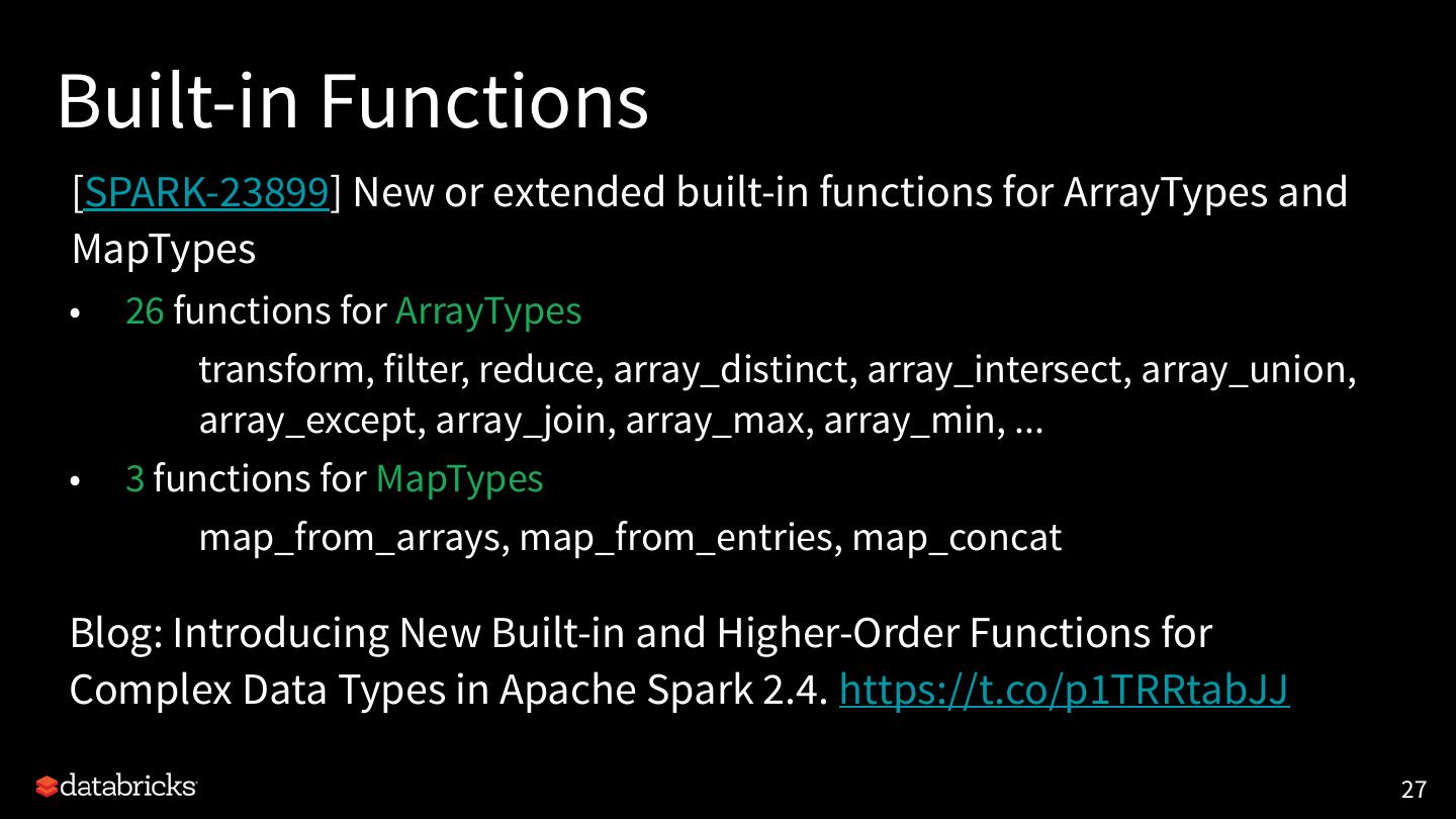 27 .Built-in Functions [SPARK-23899] New or extended built-in functions for ArrayTypes and MapTypes • 26 functions for ArrayTypes transform, filter, reduce, array_distinct, array_intersect, array_union, array_except, array_join, array_max, array_min, ... • 3 functions for MapTypes map_from_arrays, map_from_entries, map_concat Blog: Introducing New Built-in and Higher-Order Functions for Complex Data Types in Apache Spark 2.4. https://t.co/p1TRRtabJJ 27