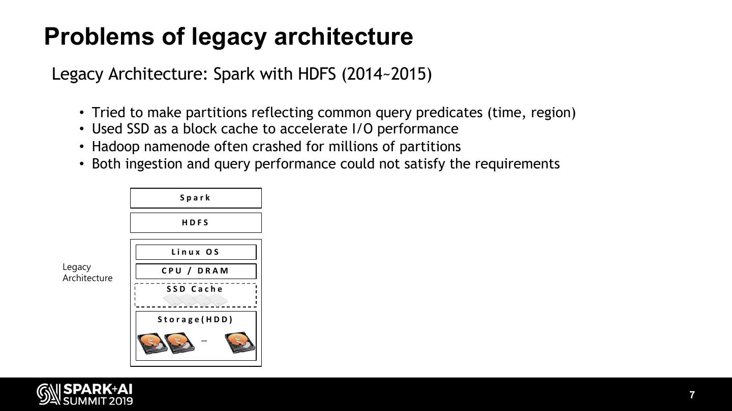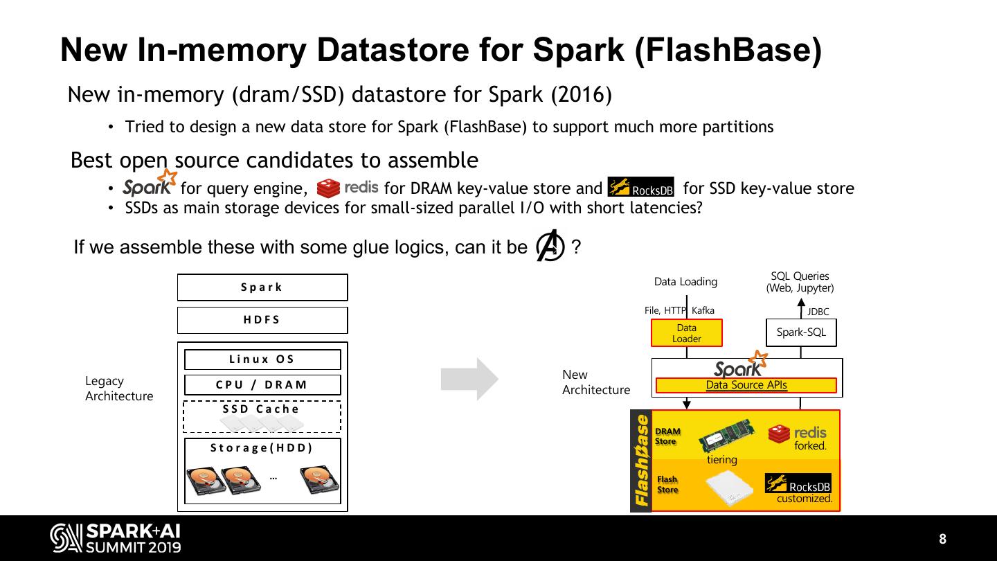 7 .Problems of legacy architecture Legacy Architecture: Spark with HDFS (2014~2015) • Tried to make partitions reflecting common query predicates (time, region) • Used SSD as a block cache to accelerate I/O performance • Hadoop namenode often crashed for millions of partitions • Both ingestion and query performance could not satisfy the requirements Spark HDFS Linux OS Legacy CPU / DRAM Architecture SSD Cache Storage(HDD) … 7