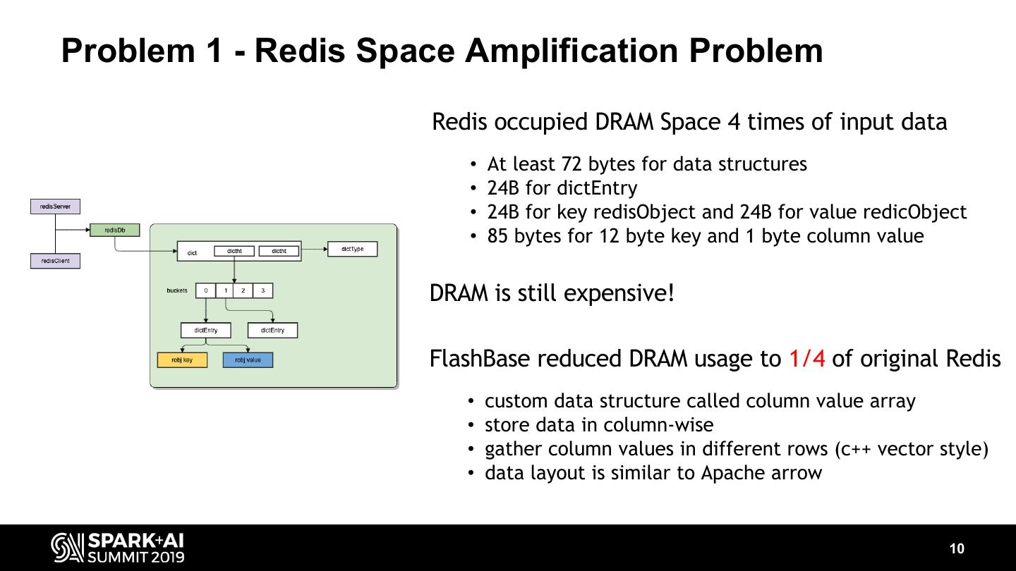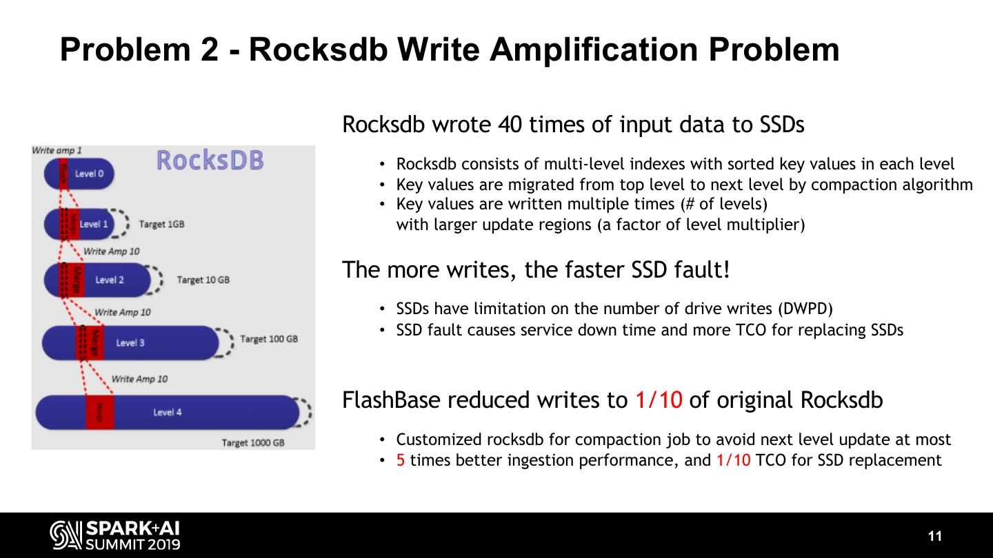 10 .Problem 1 - Redis Space Amplification Problem Redis occupied DRAM Space 4 times of input data • At least 72 bytes for data structures • 24B for dictEntry • 24B for key redisObject and 24B for value redicObject • 85 bytes for 12 byte key and 1 byte column value DRAM is still expensive! FlashBase reduced DRAM usage to 1/4 of original Redis • custom data structure called column value array • store data in column-wise • gather column values in different rows (c++ vector style) • data layout is similar to Apache arrow 10