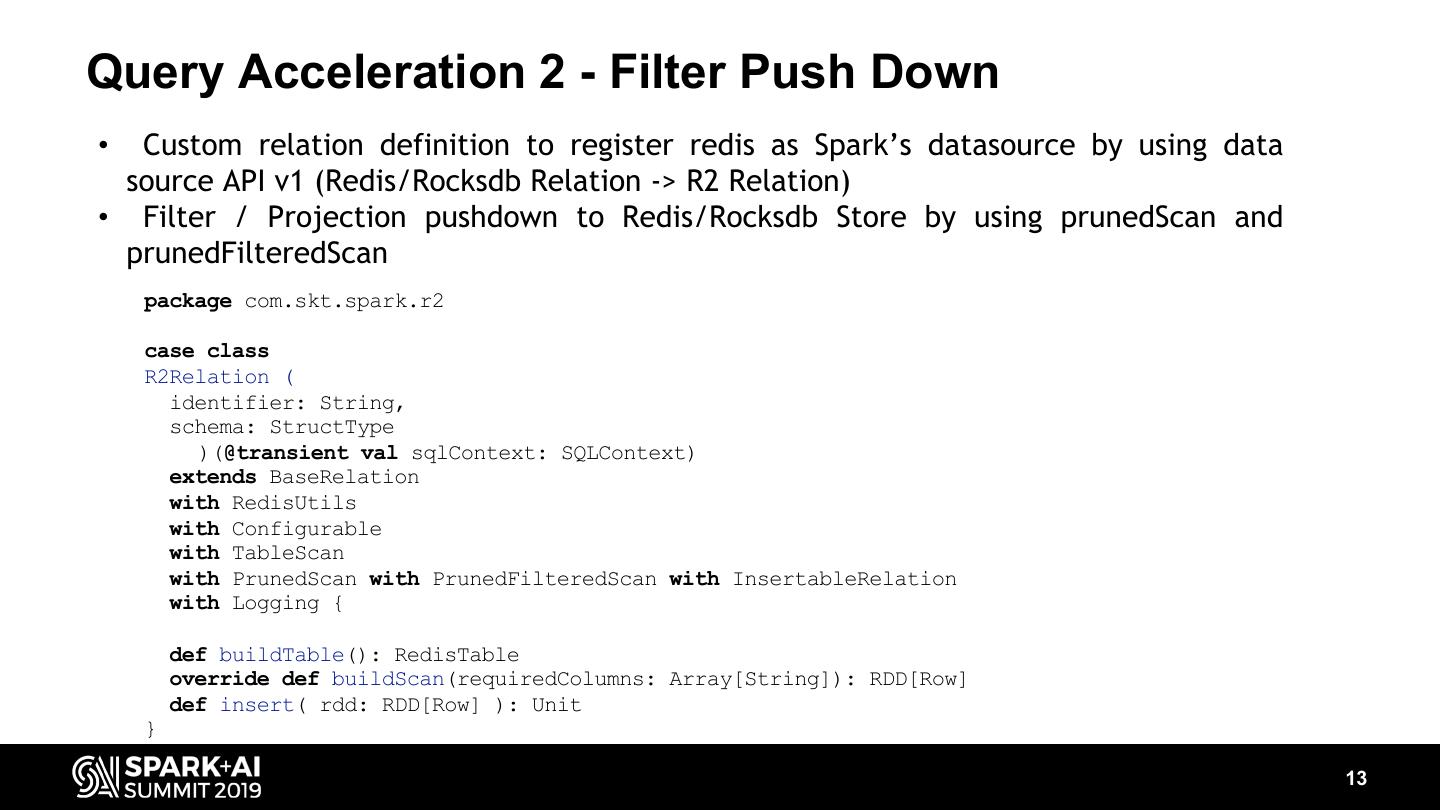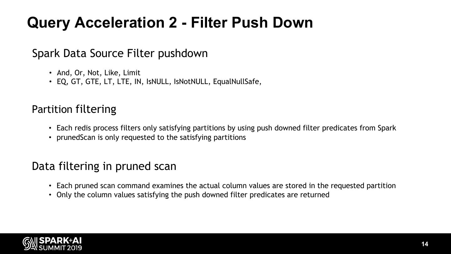 13 .Query Acceleration 2 - Filter Push Down • Custom relation definition to register redis as Spark’s datasource by using data source API v1 (Redis/Rocksdb Relation -> R2 Relation) • Filter / Projection pushdown to Redis/Rocksdb Store by using prunedScan and prunedFilteredScan package com.skt.spark.r2 case class R2Relation ( identifier: String, schema: StructType )(@transient val sqlContext: SQLContext) extends BaseRelation with RedisUtils with Configurable with TableScan with PrunedScan with PrunedFilteredScan with InsertableRelation with Logging { def buildTable(): RedisTable override def buildScan(requiredColumns: Array[String]): RDD[Row] def insert( rdd: RDD[Row] ): Unit } 13