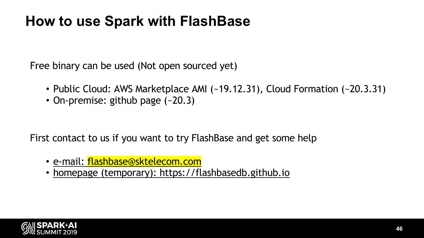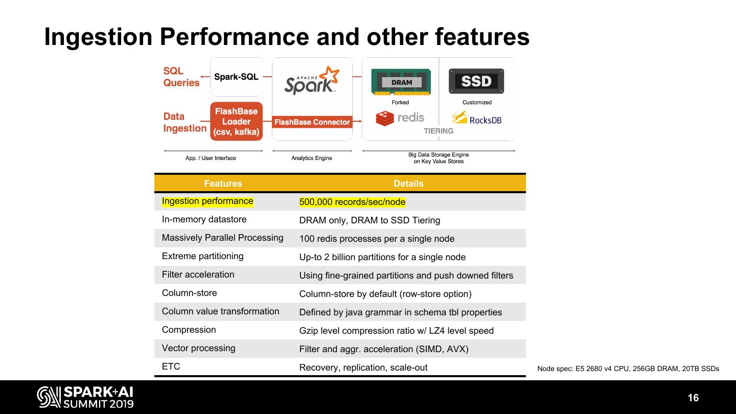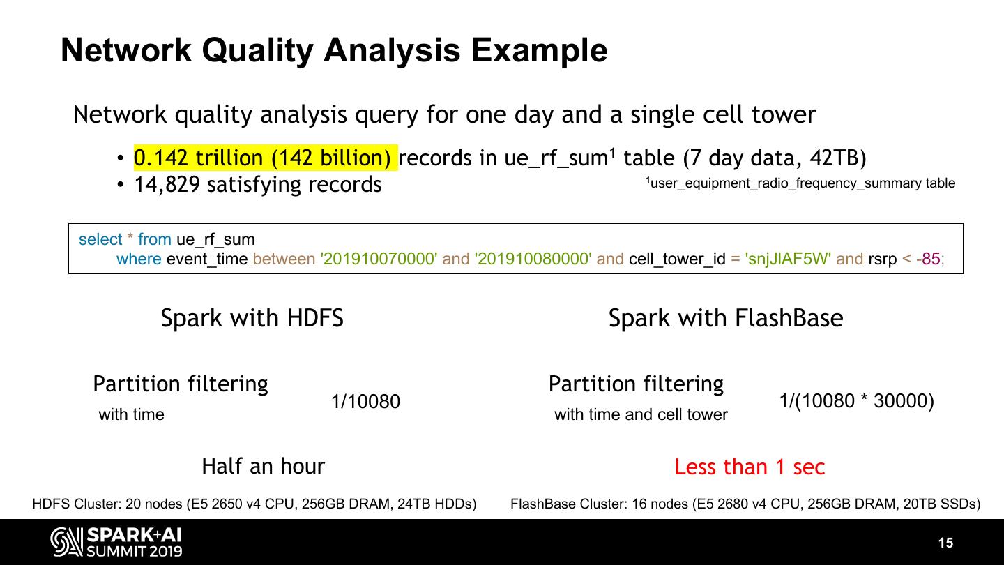 15 . Network Quality Analysis Example Network quality analysis query for one day and a single cell tower • 0.142 trillion (142 billion) records in ue_rf_sum1 table (7 day data, 42TB) • 14,829 satisfying records 1user_equipment_radio_frequency_summary table select * from ue_rf_sum where event_time between '201910070000' and '201910080000' and cell_tower_id = 'snjJlAF5W' and rsrp < -85; Spark with HDFS Spark with FlashBase Partition filtering Partition filtering 1/10080 1/(10080 * 30000) with time with time and cell tower Half an hour Less than 1 sec HDFS Cluster: 20 nodes (E5 2650 v4 CPU, 256GB DRAM, 24TB HDDs) FlashBase Cluster: 16 nodes (E5 2680 v4 CPU, 256GB DRAM, 20TB SSDs) 15