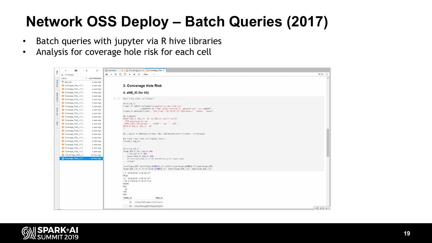 19 . Network OSS Deploy – Batch Queries (2017) • Batch queries with jupyter via R hive libraries • Analysis for coverage hole risk for each cell 19