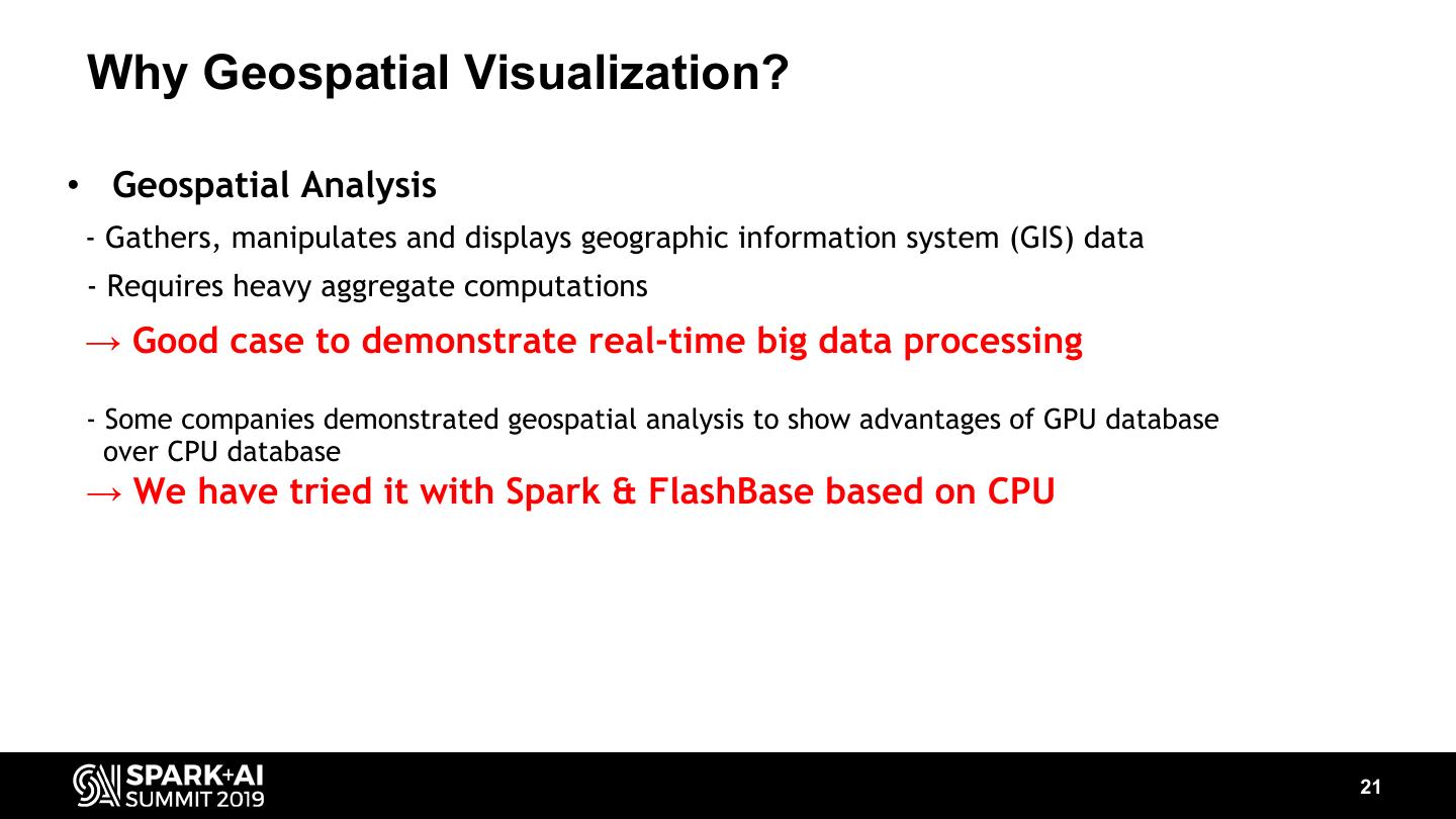 21 . Why Geospatial Visualization? • Geospatial Analysis - Gathers, manipulates and displays geographic information system (GIS) data - Requires heavy aggregate computations → Good case to demonstrate real-time big data processing - Some companies demonstrated geospatial analysis to show advantages of GPU database over CPU database → We have tried it with Spark & FlashBase based on CPU 21