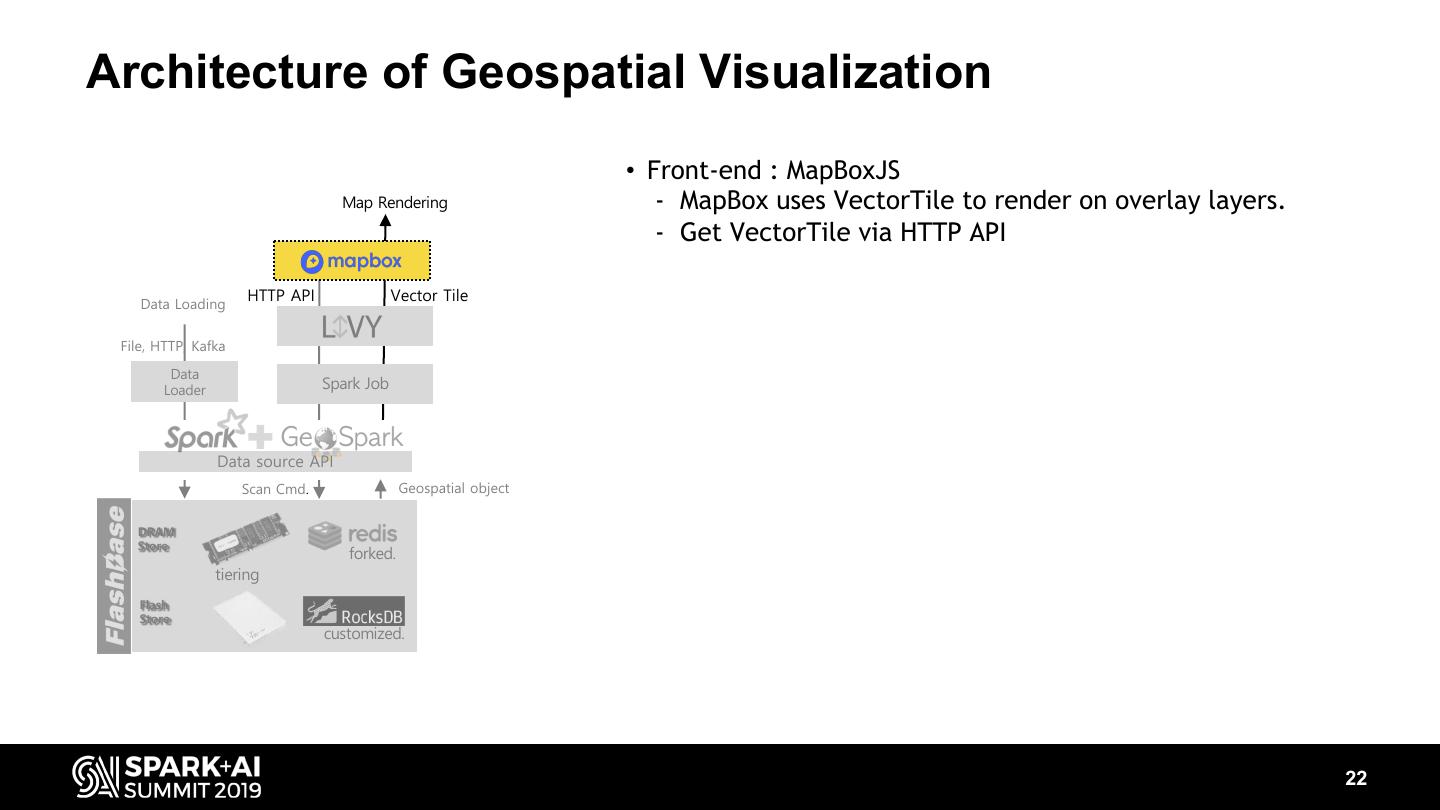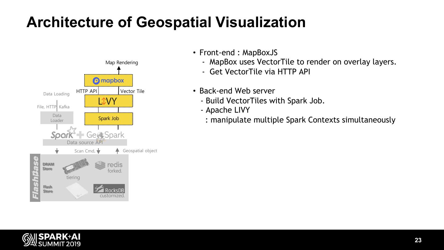 22 .Architecture of Geospatial Visualization • Front-end : MapBoxJS Map Rendering - MapBox uses VectorTile to render on overlay layers. - Get VectorTile via HTTP API Data Loading HTTP API Vector Tile File, HTTP, Kafka Data Loader Spark Job Data source API Scan Cmd. Geospatial object DRAM Store forked. tiering Flash Store customized. 22