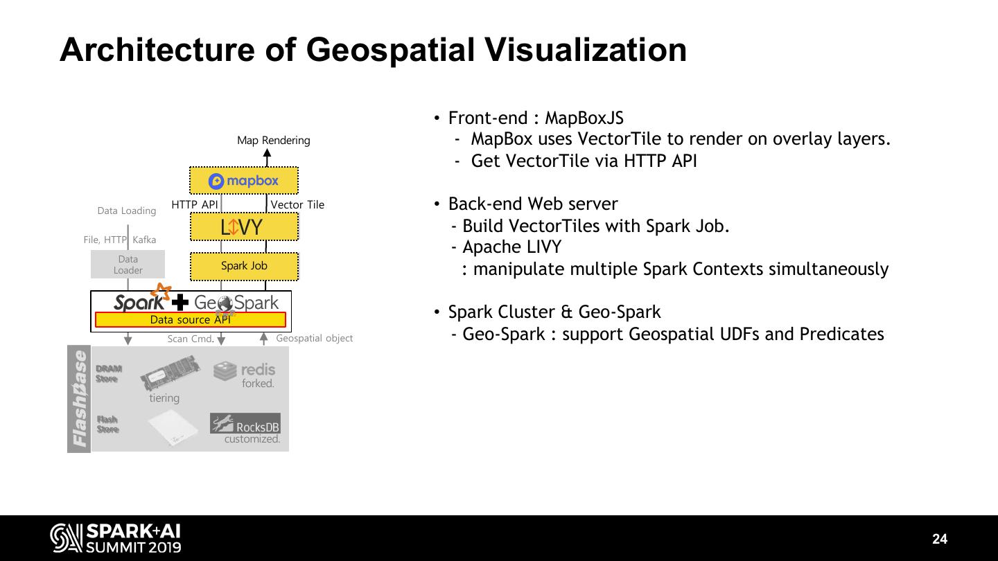 23 .Architecture of Geospatial Visualization • Front-end : MapBoxJS Map Rendering - MapBox uses VectorTile to render on overlay layers. - Get VectorTile via HTTP API Data Loading HTTP API Vector Tile • Back-end Web server - Build VectorTiles with Spark Job. File, HTTP, Kafka - Apache LIVY Data Spark Job Spark Job Loader : manipulate multiple Spark Contexts simultaneously Data source API Scan Cmd. Geospatial object DRAM Store forked. tiering Flash Store customized. 23