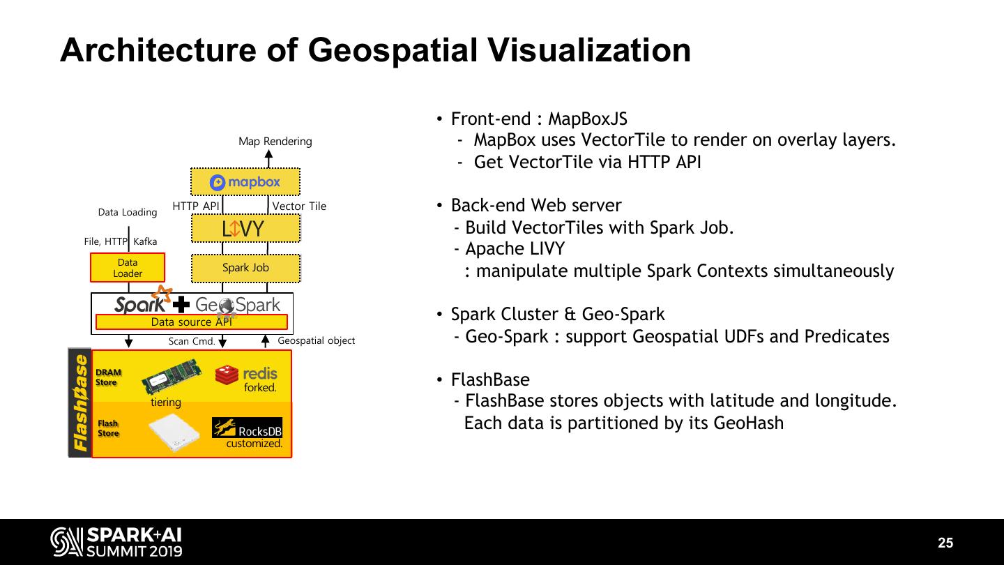 24 .Architecture of Geospatial Visualization • Front-end : MapBoxJS Map Rendering - MapBox uses VectorTile to render on overlay layers. - Get VectorTile via HTTP API Data Loading HTTP API Vector Tile • Back-end Web server - Build VectorTiles with Spark Job. File, HTTP, Kafka - Apache LIVY Data Spark Job Spark Job Loader : manipulate multiple Spark Contexts simultaneously Data source API • Spark Cluster & Geo-Spark Scan Cmd. Geospatial object - Geo-Spark : support Geospatial UDFs and Predicates DRAM Store forked. tiering Flash Store customized. 24