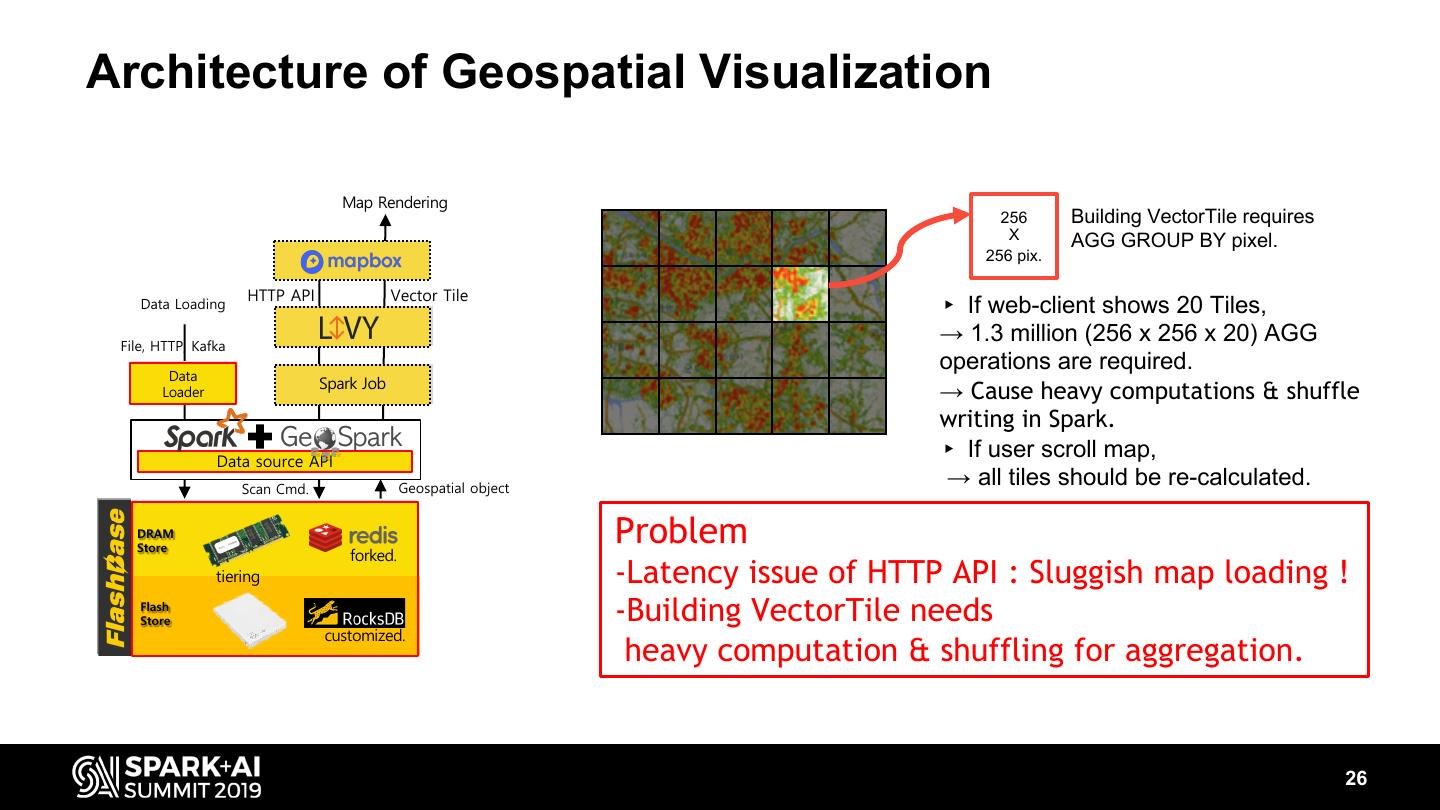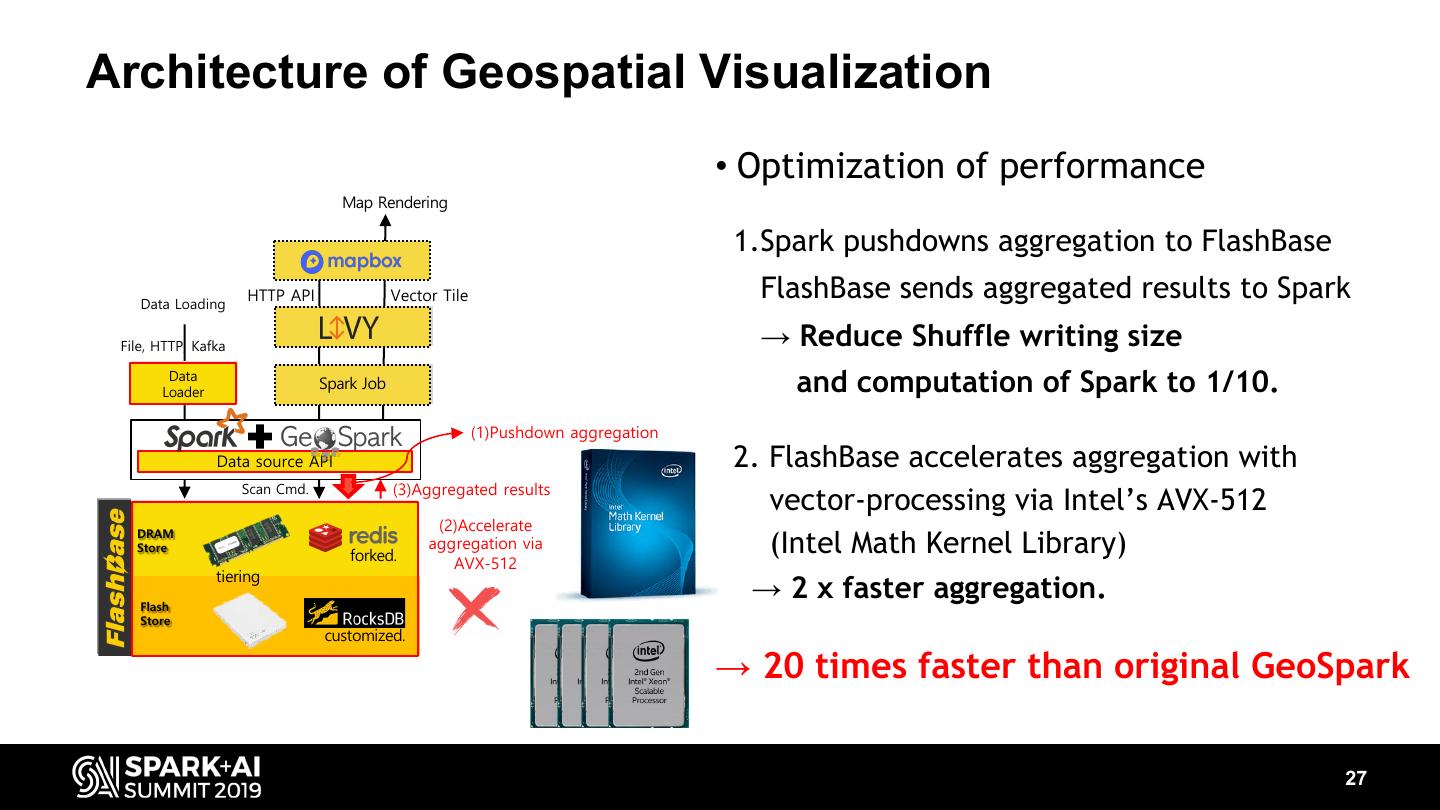 26 .Architecture of Geospatial Visualization Map Rendering 256 Building VectorTile requires X AGG GROUP BY pixel. 256 pix. HTTP API Vector Tile Data Loading ▸ If web-client shows 20 Tiles, File, HTTP, Kafka → 1.3 million (256 x 256 x 20) AGG Data operations are required. Data Spark Job Spark Job Loader Loader → Cause heavy computations & shuffle writing in Spark. Data source API ▸ If user scroll map, Scan Cmd. Geospatial object → all tiles should be re-calculated. DRAM DRAM Store Store forked. Problem tiering -Latency issue of HTTP API : Sluggish map loading ! Flash Flash Store -Building VectorTile needs customized. heavy computation & shuffling for aggregation. 26