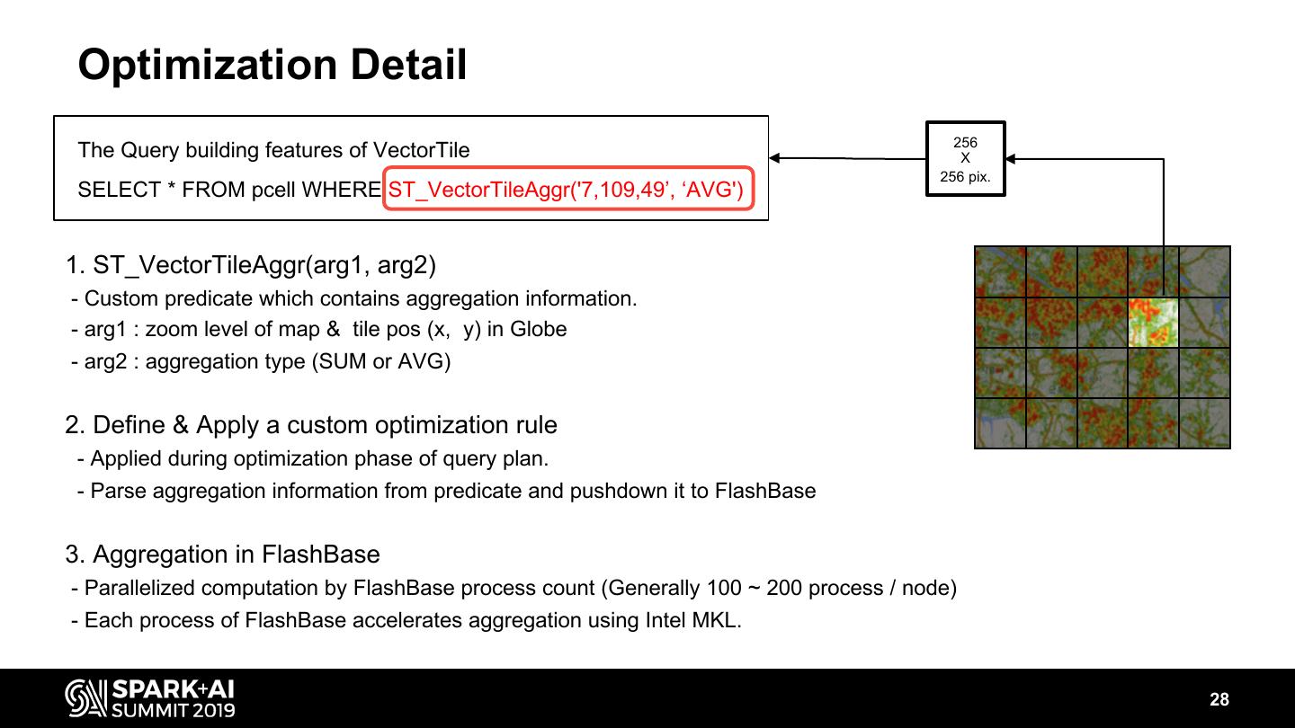 28 . Optimization Detail 256 The Query building features of VectorTile X 256 pix. SELECT * FROM pcell WHERE ST_VectorTileAggr('7,109,49’, ‘AVG') 1. ST_VectorTileAggr(arg1, arg2) - Custom predicate which contains aggregation information. - arg1 : zoom level of map & tile pos (x, y) in Globe - arg2 : aggregation type (SUM or AVG) 2. Define & Apply a custom optimization rule - Applied during optimization phase of query plan. - Parse aggregation information from predicate and pushdown it to FlashBase 3. Aggregation in FlashBase - Parallelized computation by FlashBase process count (Generally 100 ~ 200 process / node) - Each process of FlashBase accelerates aggregation using Intel MKL. 28