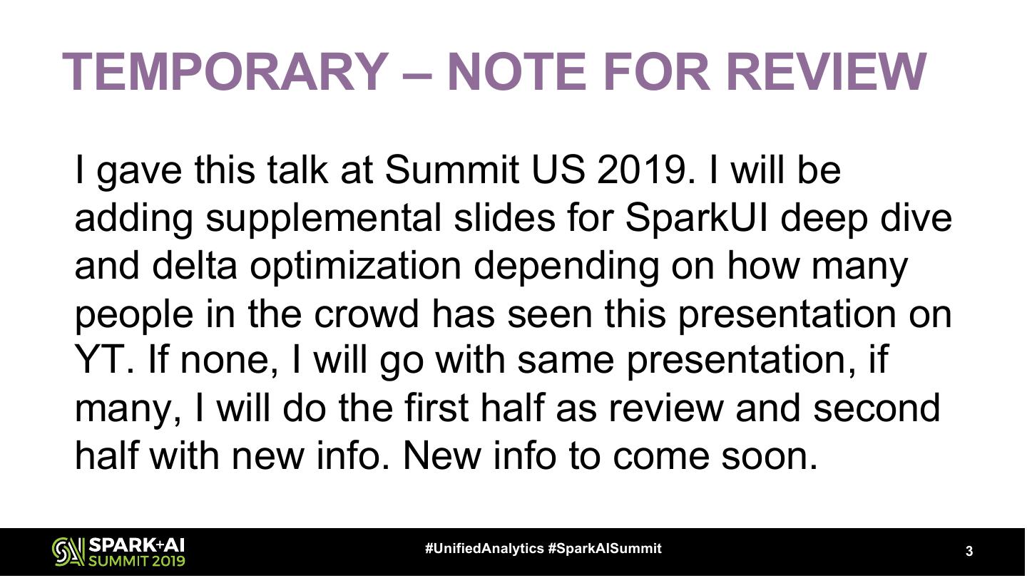 3 .TEMPORARY – NOTE FOR REVIEW I gave this talk at Summit US 2019. I will be adding supplemental slides for SparkUI deep dive and delta optimization depending on how many people in the crowd has seen this presentation on YT. If none, I will go with same presentation, if many, I will do the first half as review and second half with new info. New info to come soon. #UnifiedAnalytics #SparkAISummit 3
