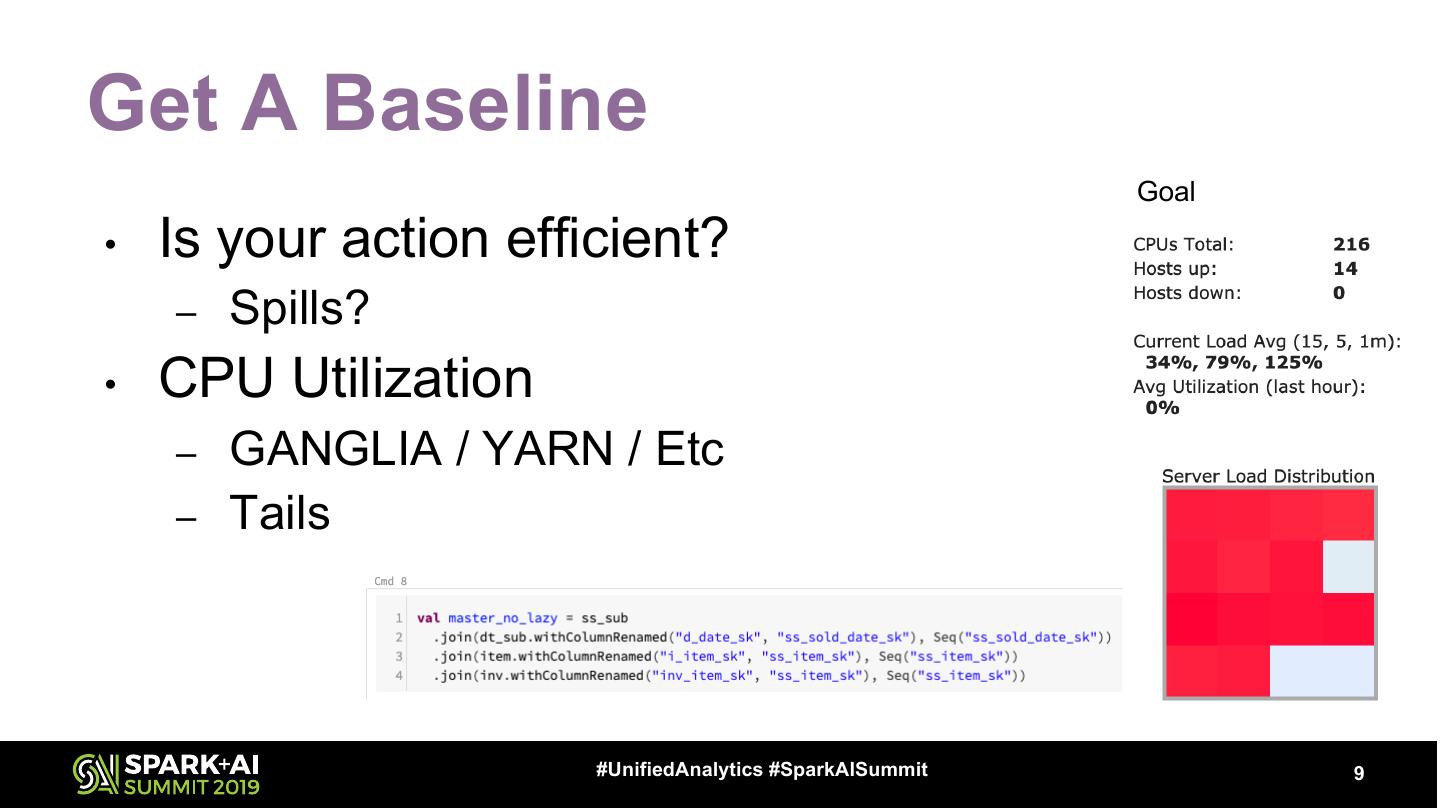 9 .Get A Baseline Goal • Is your action efficient? – Spills? • CPU Utilization – GANGLIA / YARN / Etc – Tails #UnifiedAnalytics #SparkAISummit 9