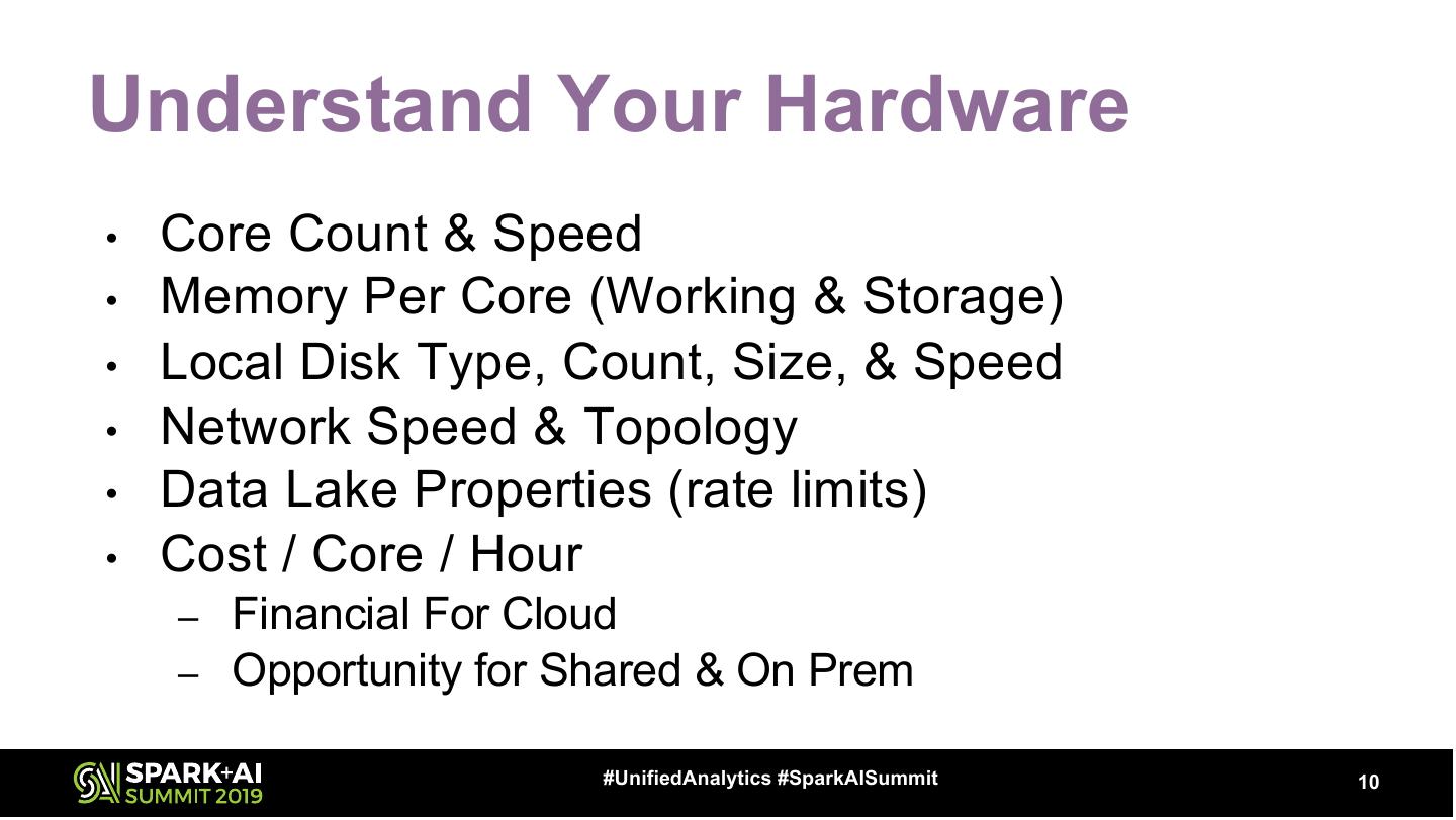 10 .Understand Your Hardware • Core Count & Speed • Memory Per Core (Working & Storage) • Local Disk Type, Count, Size, & Speed • Network Speed & Topology • Data Lake Properties (rate limits) • Cost / Core / Hour – Financial For Cloud – Opportunity for Shared & On Prem #UnifiedAnalytics #SparkAISummit 10