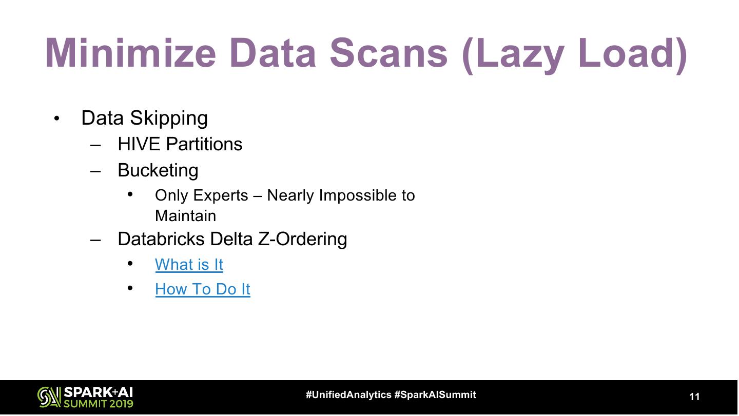 11 .Minimize Data Scans (Lazy Load) • Data Skipping – HIVE Partitions – Bucketing • Only Experts – Nearly Impossible to Maintain – Databricks Delta Z-Ordering • What is It • How To Do It #UnifiedAnalytics #SparkAISummit 11