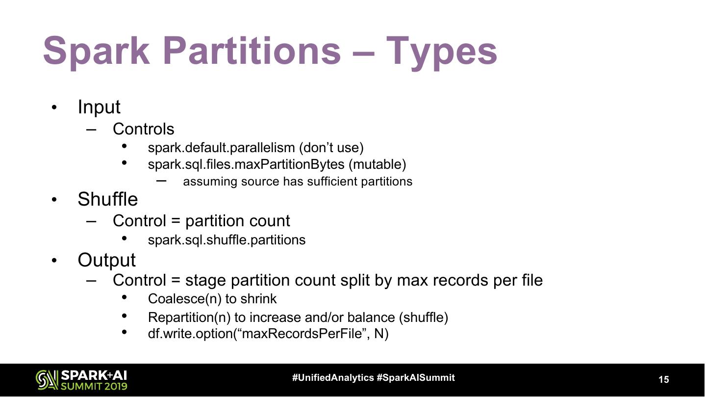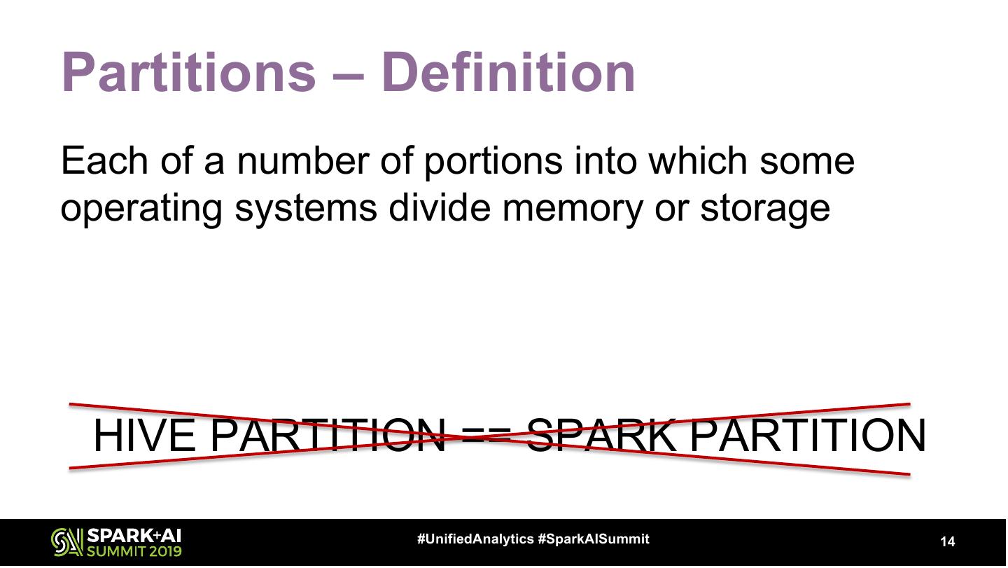 14 .Partitions – Definition Each of a number of portions into which some operating systems divide memory or storage HIVE PARTITION == SPARK PARTITION #UnifiedAnalytics #SparkAISummit 14