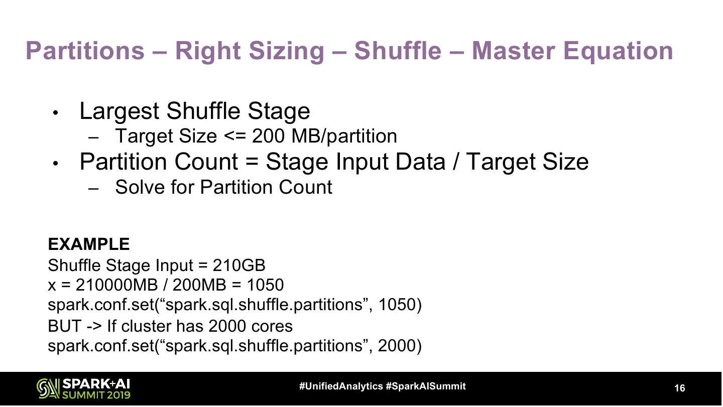 16 .Partitions – Right Sizing – Shuffle – Master Equation • Largest Shuffle Stage – Target Size <= 200 MB/partition • Partition Count = Stage Input Data / Target Size – Solve for Partition Count EXAMPLE Shuffle Stage Input = 210GB x = 210000MB / 200MB = 1050 spark.conf.set(“spark.sql.shuffle.partitions”, 1050) BUT -> If cluster has 2000 cores spark.conf.set(“spark.sql.shuffle.partitions”, 2000) #UnifiedAnalytics #SparkAISummit 16