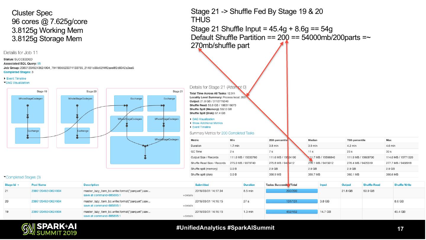 17 .Cluster Spec Stage 21 -> Shuffle Fed By Stage 19 & 20 96 cores @ 7.625g/core THUS 3.8125g Working Mem Stage 21 Shuffle Input = 45.4g + 8.6g == 54g 3.8125g Storage Mem Default Shuffle Partition == 200 == 54000mb/200parts =~ 270mb/shuffle part #UnifiedAnalytics #SparkAISummit 17
