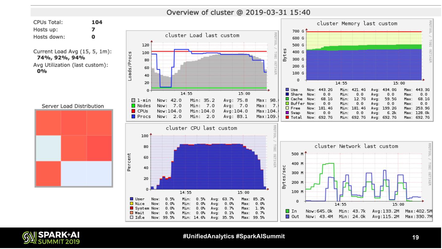 18 .Cluster Spec 96 cores @ 7.625g/core 3.8125g Working Mem 3.8125g Storage Mem 480 shuffle partitions – WHY? Target shuffle part size == 100m p = 54g / 100m == 540 540p / 96 cores == 5.625 NO SPILL 96 * 5 == 480 If p == 540 another 60p have to be loaded and processed after first cycle is complete #UnifiedAnalytics #SparkAISummit 18