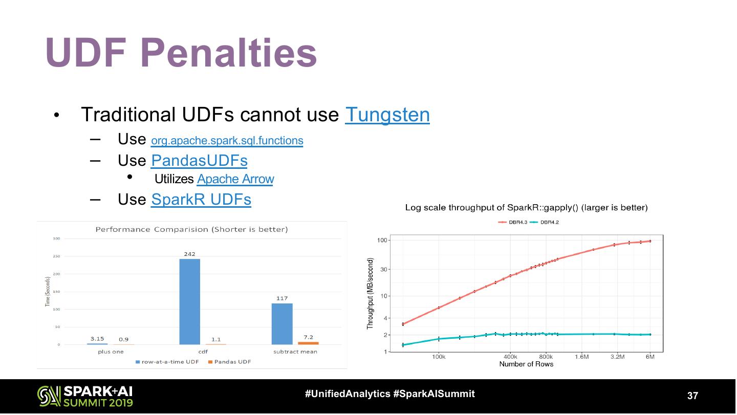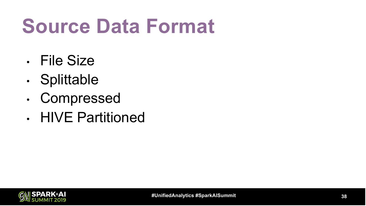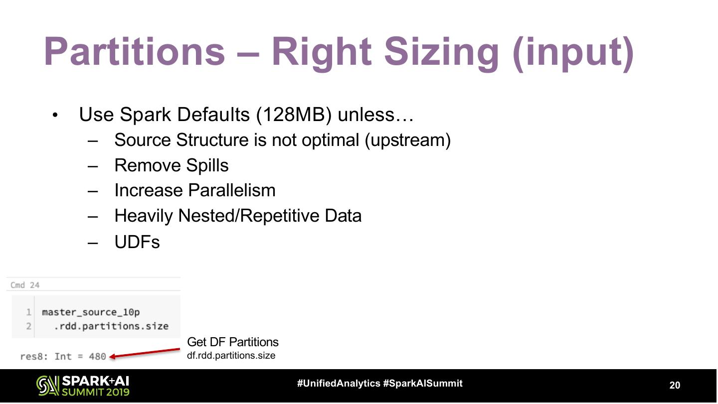 20 .Partitions – Right Sizing (input) • Use Spark Defaults (128MB) unless… – Source Structure is not optimal (upstream) – Remove Spills – Increase Parallelism – Heavily Nested/Repetitive Data – UDFs Get DF Partitions df.rdd.partitions.size #UnifiedAnalytics #SparkAISummit 20