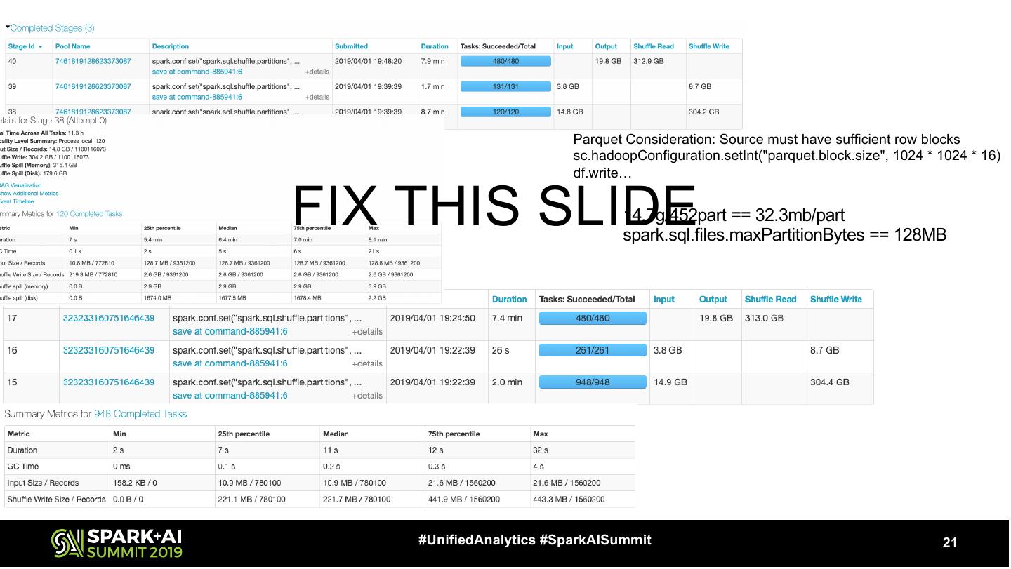 21 . Parquet Consideration: Source must have sufficient row blocks sc.hadoopConfiguration.setInt("parquet.block.size", 1024 * 1024 * 16) df.write… FIX THIS SLIDE 14.7g/452part == 32.3mb/part spark.sql.files.maxPartitionBytes == 128MB #UnifiedAnalytics #SparkAISummit 21