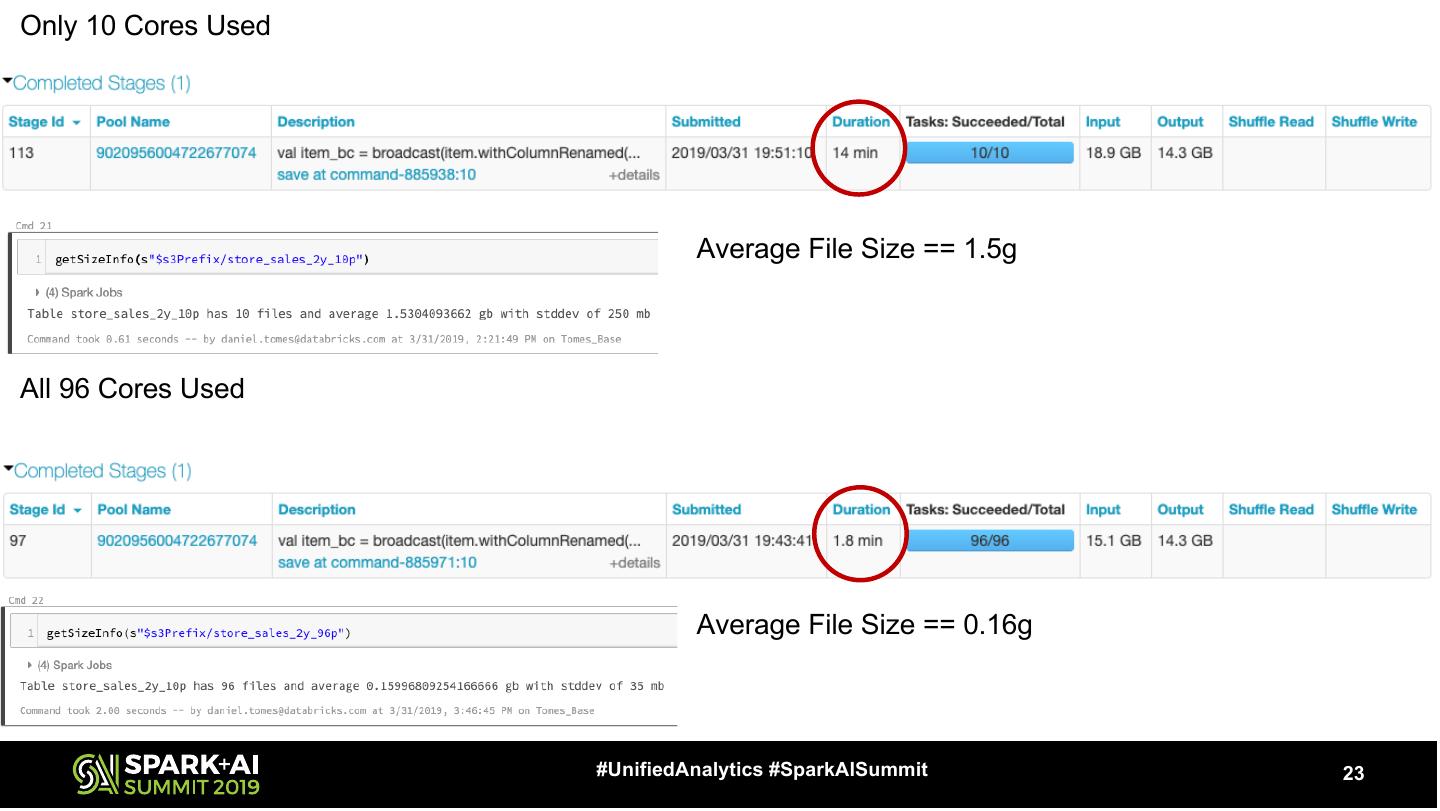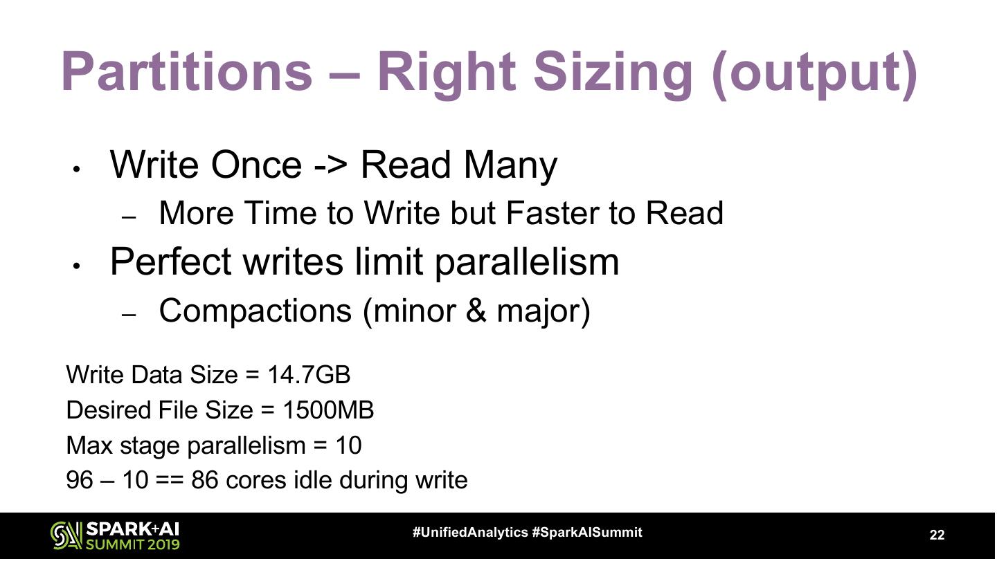 22 .Partitions – Right Sizing (output) • Write Once -> Read Many – More Time to Write but Faster to Read • Perfect writes limit parallelism – Compactions (minor & major) Write Data Size = 14.7GB Desired File Size = 1500MB Max stage parallelism = 10 96 – 10 == 86 cores idle during write #UnifiedAnalytics #SparkAISummit 22