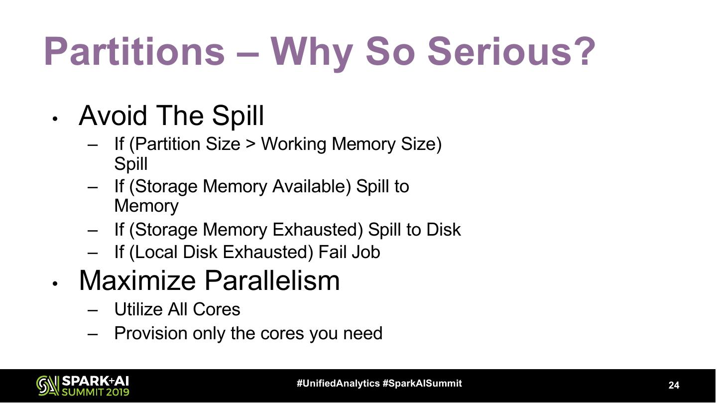 24 .Partitions – Why So Serious? • Avoid The Spill – If (Partition Size > Working Memory Size) Spill – If (Storage Memory Available) Spill to Memory – If (Storage Memory Exhausted) Spill to Disk – If (Local Disk Exhausted) Fail Job • Maximize Parallelism – Utilize All Cores – Provision only the cores you need #UnifiedAnalytics #SparkAISummit 24