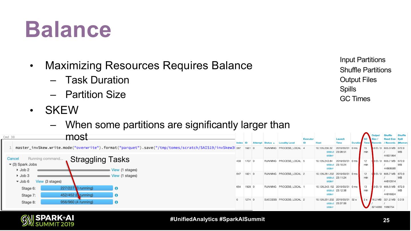 25 .Balance Input Partitions • Maximizing Resources Requires Balance Shuffle Partitions – Task Duration Output Files Spills – Partition Size GC Times • SKEW – When some partitions are significantly larger than most Straggling Tasks #UnifiedAnalytics #SparkAISummit 25