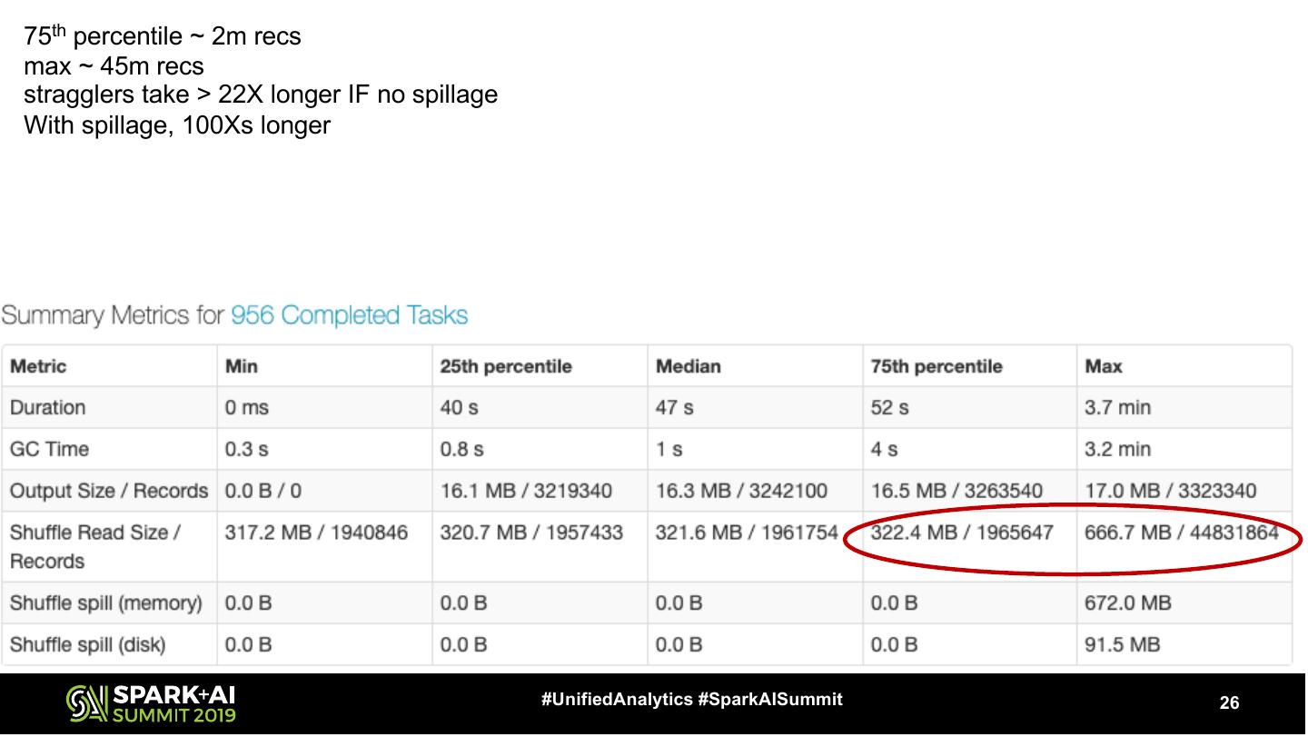26 .75th percentile ~ 2m recs max ~ 45m recs stragglers take > 22X longer IF no spillage With spillage, 100Xs longer #UnifiedAnalytics #SparkAISummit 26