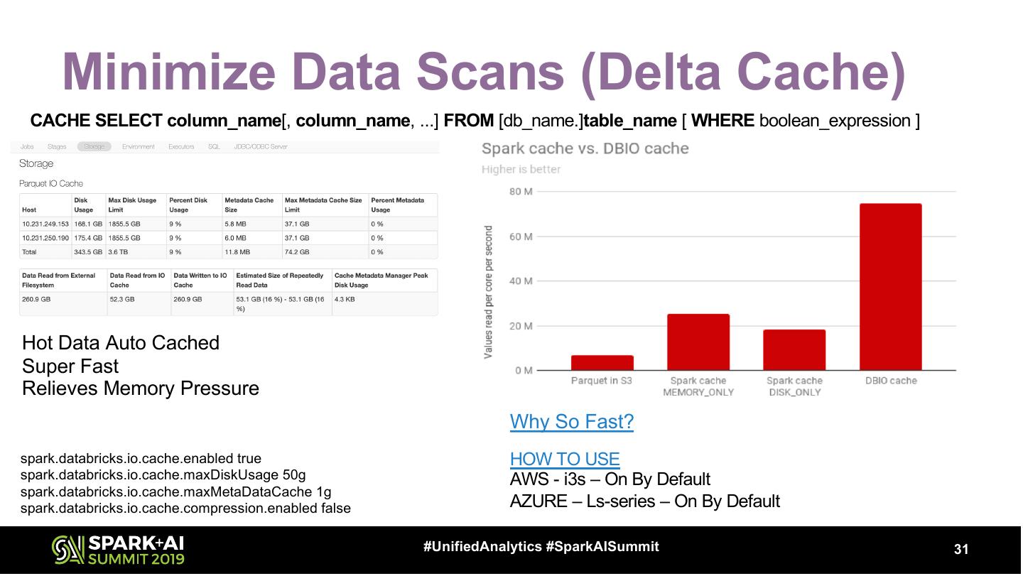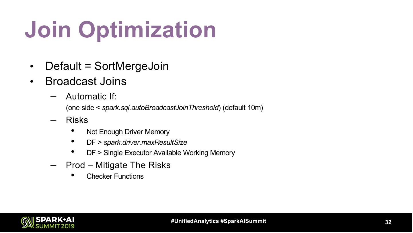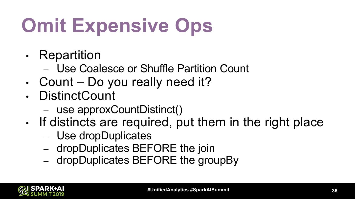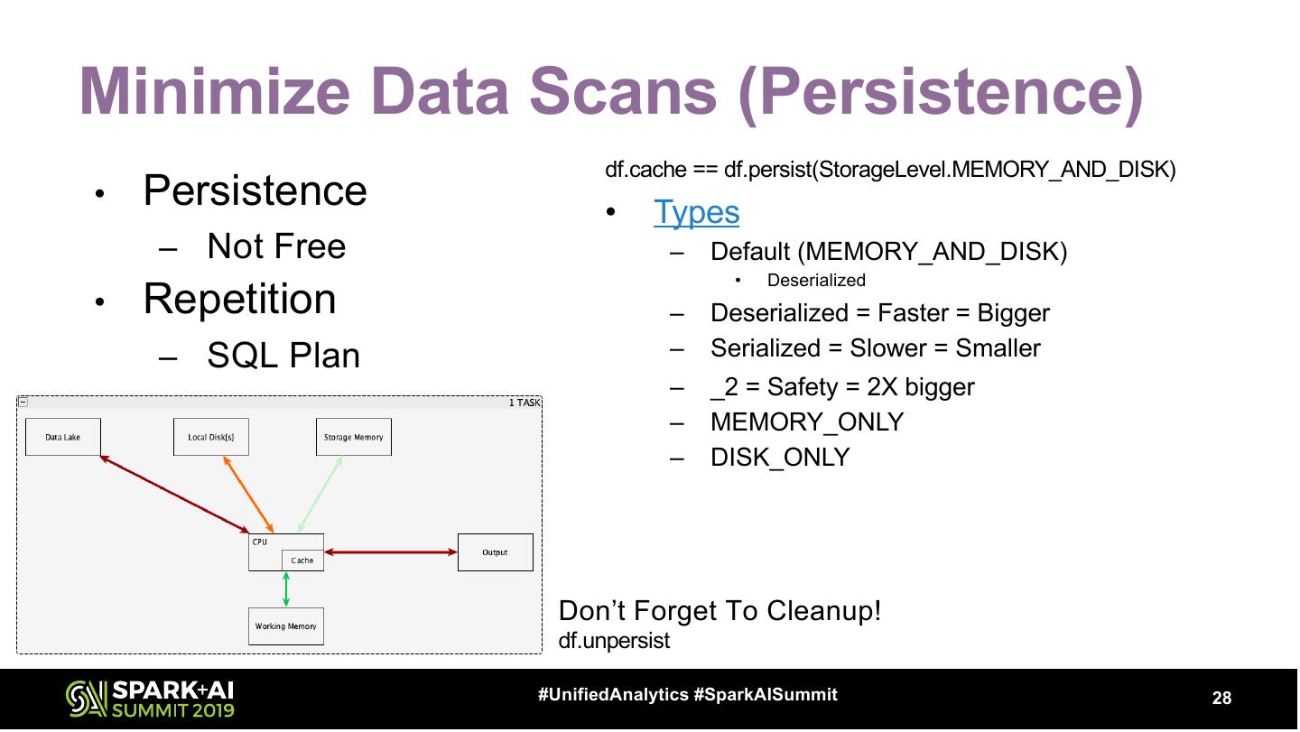 28 .Minimize Data Scans (Persistence) df.cache == df.persist(StorageLevel.MEMORY_AND_DISK) • Persistence • Types – Not Free – Default (MEMORY_AND_DISK) • Deserialized • Repetition – Deserialized = Faster = Bigger – SQL Plan – Serialized = Slower = Smaller – _2 = Safety = 2X bigger – MEMORY_ONLY – DISK_ONLY Don’t Forget To Cleanup! df.unpersist #UnifiedAnalytics #SparkAISummit 28