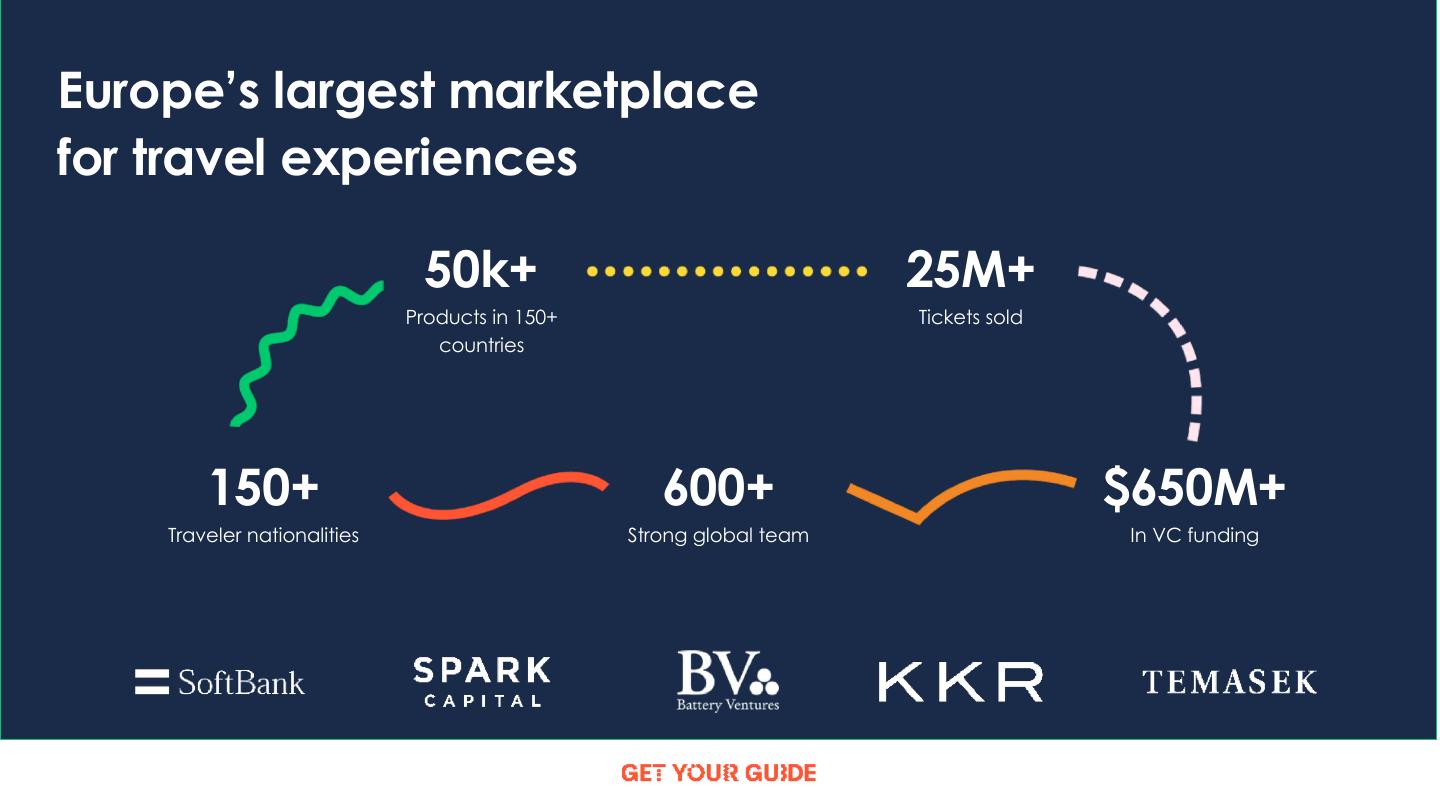 7 .Europe’s largest marketplace for travel experiences 50k+ 25M+ Products in 150+ Tickets sold countries 150+ 600+ $650M+ Traveler nationalities Strong global team In VC funding
