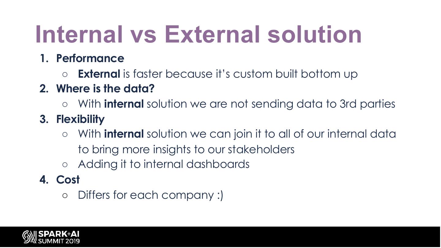 10 .Internal vs External solution 1. Performance ○ External is faster because it’s custom built bottom up 2. Where is the data? ○ With internal solution we are not sending data to 3rd parties 3. Flexibility ○ With internal solution we can join it to all of our internal data to bring more insights to our stakeholders ○ Adding it to internal dashboards 4. Cost ○ Differs for each company :)