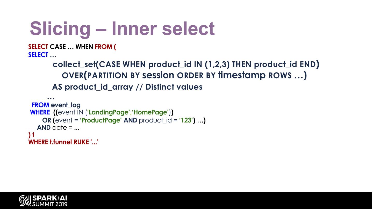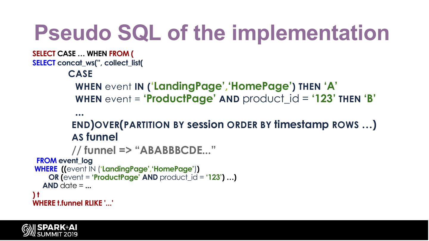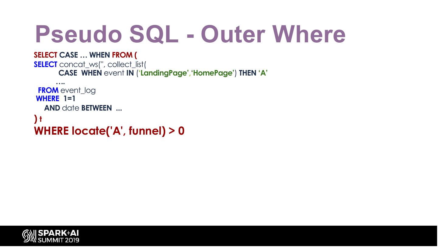18 .Pseudo SQL - Innere Where Fixed SELECT CASE … WHEN FROM ( SELECT concat_ws('', collect_list( CASE WHEN event IN (‘LandingPage’,‘HomePage’) THEN ‘A’ …. FROM event_log WHERE 1=1 AND date BETWEEN ... AND ( (event IN (‘LandingPage’,‘HomePage’)) OR (event = ‘ProductPage’) OR (event …) ) AND ( (event IN (‘LandingPage’,‘HomePage’)) OR (event = ‘ProductPage’ AND product_id = ‘123’) …) )t WHERE t.funnel RLIKE '...'