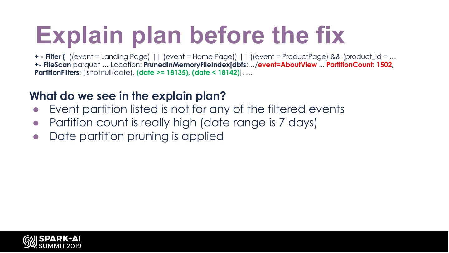 17 . Explain plan before the fix + - Filter ( ((event = Landing Page) || (event = Home Page)) || ((event = ProductPage) && (product_id = … +- FileScan parquet … Location: PrunedInMemoryFileIndex[dbfs:…/event=AboutView ... PartitionCount: 1502, PartitionFilters: [isnotnull(date), (date >= 18135), (date < 18142)], … What do we see in the explain plan? ● Event partition listed is not for any of the filtered events ● Partition count is really high (date range is 7 days) ● Date partition pruning is applied
