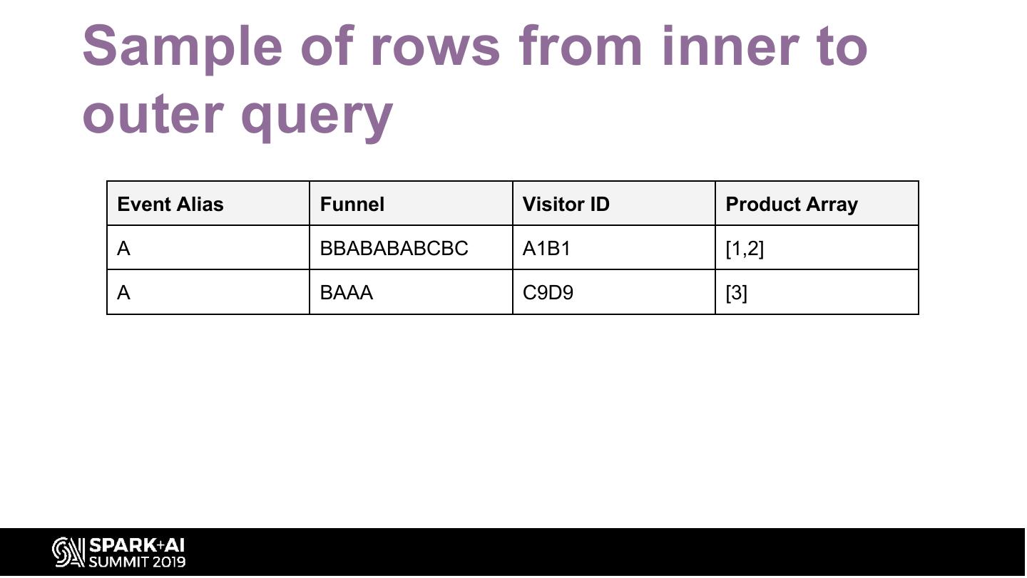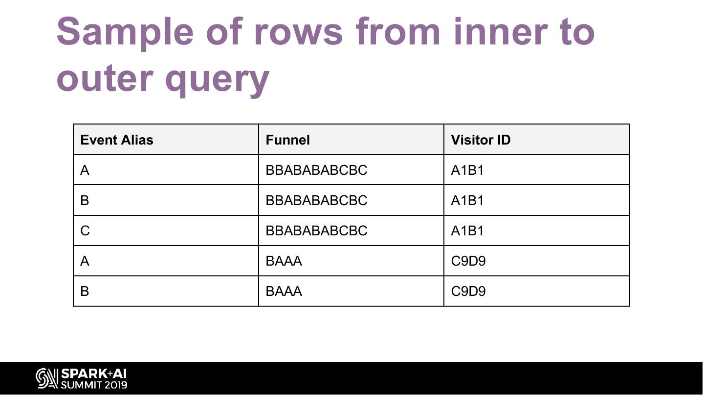 20 .Sample of rows from inner to outer query Event Alias Funnel Visitor ID A BBABABABCBC A1B1 B BBABABABCBC A1B1 C BBABABABCBC A1B1 A BAAA C9D9 B BAAA C9D9
