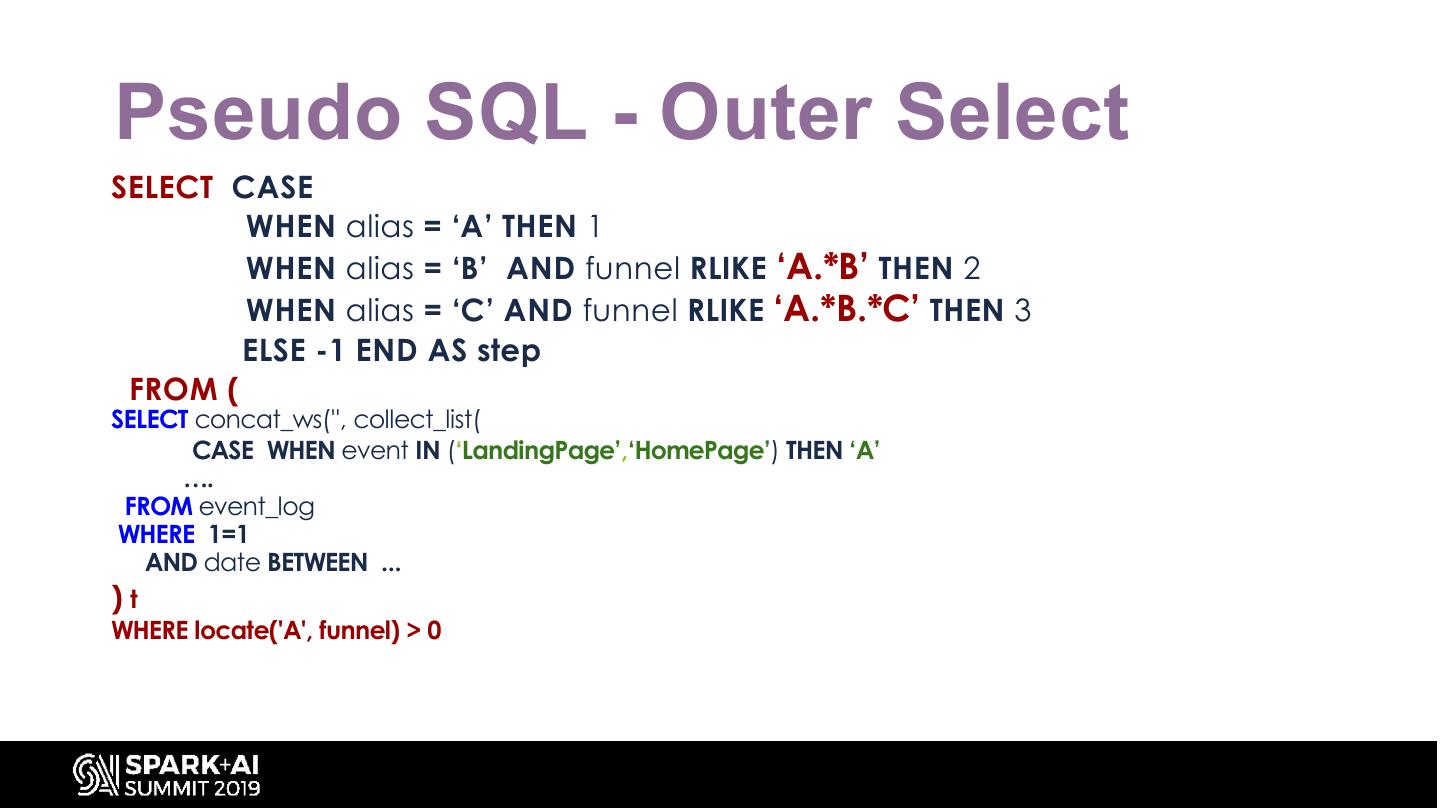 21 .Pseudo SQL - Outer Where SELECT CASE … WHEN FROM ( SELECT concat_ws('', collect_list( CASE WHEN event IN (‘LandingPage’,‘HomePage’) THEN ‘A’ …. FROM event_log WHERE 1=1 AND date BETWEEN ... )t WHERE t.funnel RLIKE 'A.*B.*C.*D.*E'