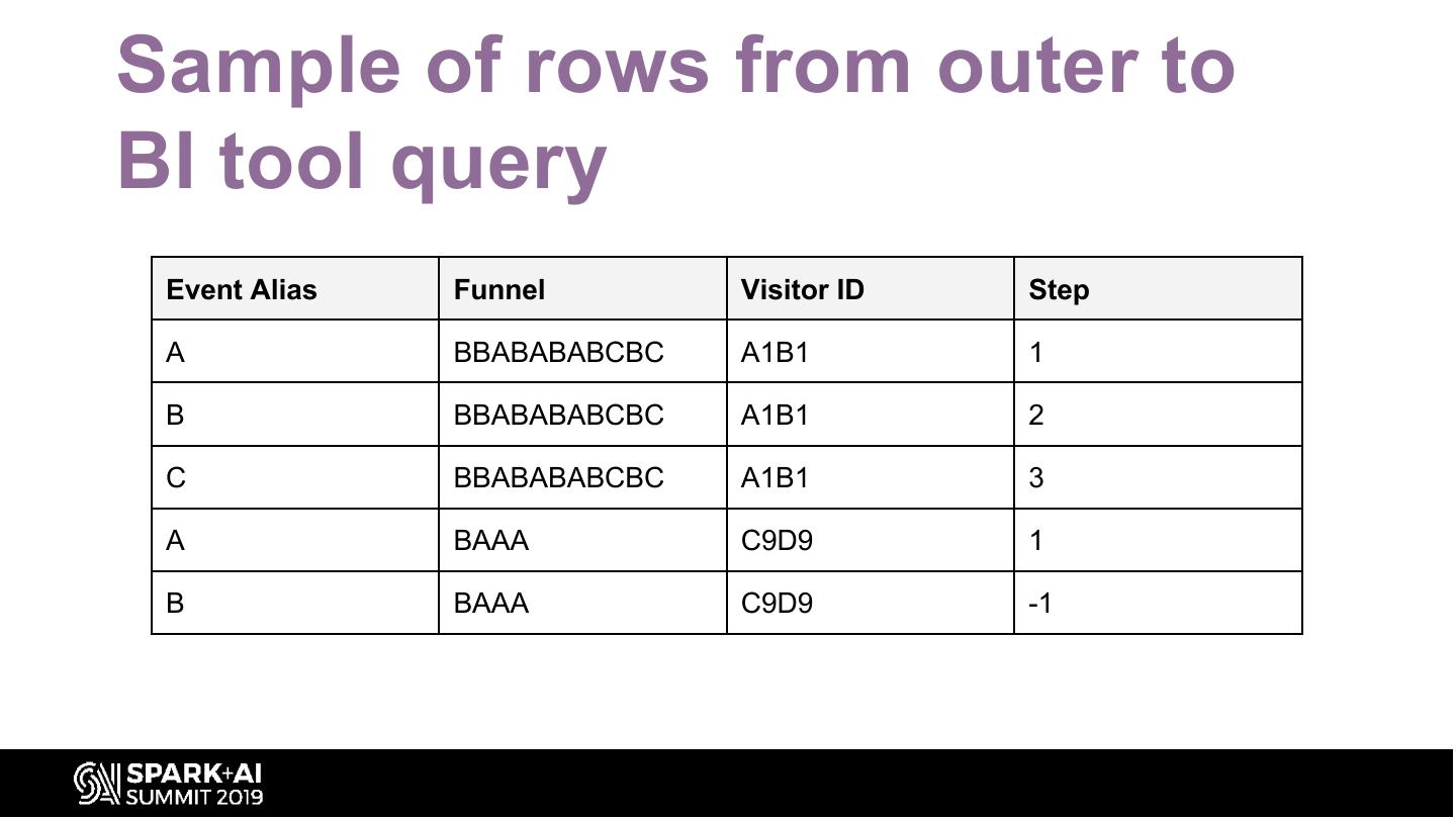 25 .Sample of rows from outer to BI tool query Event Alias Funnel Visitor ID Step A BBABABABCBC A1B1 1 B BBABABABCBC A1B1 2 C BBABABABCBC A1B1 3 A BAAA C9D9 1 B BAAA C9D9 -1