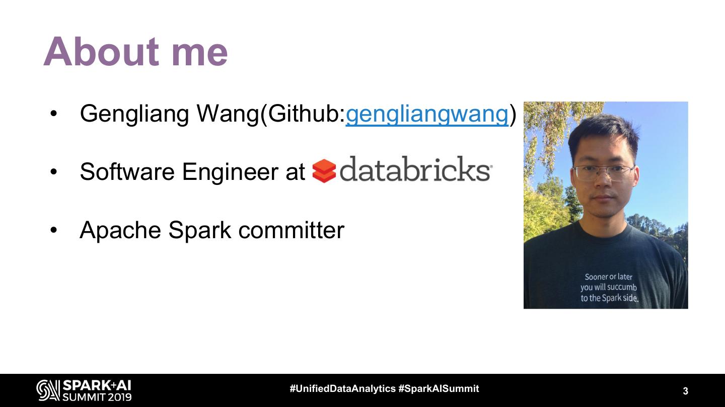 3 .About me • Gengliang Wang(Github:gengliangwang) • Software Engineer at • Apache Spark committer #UnifiedDataAnalytics #SparkAISummit 3