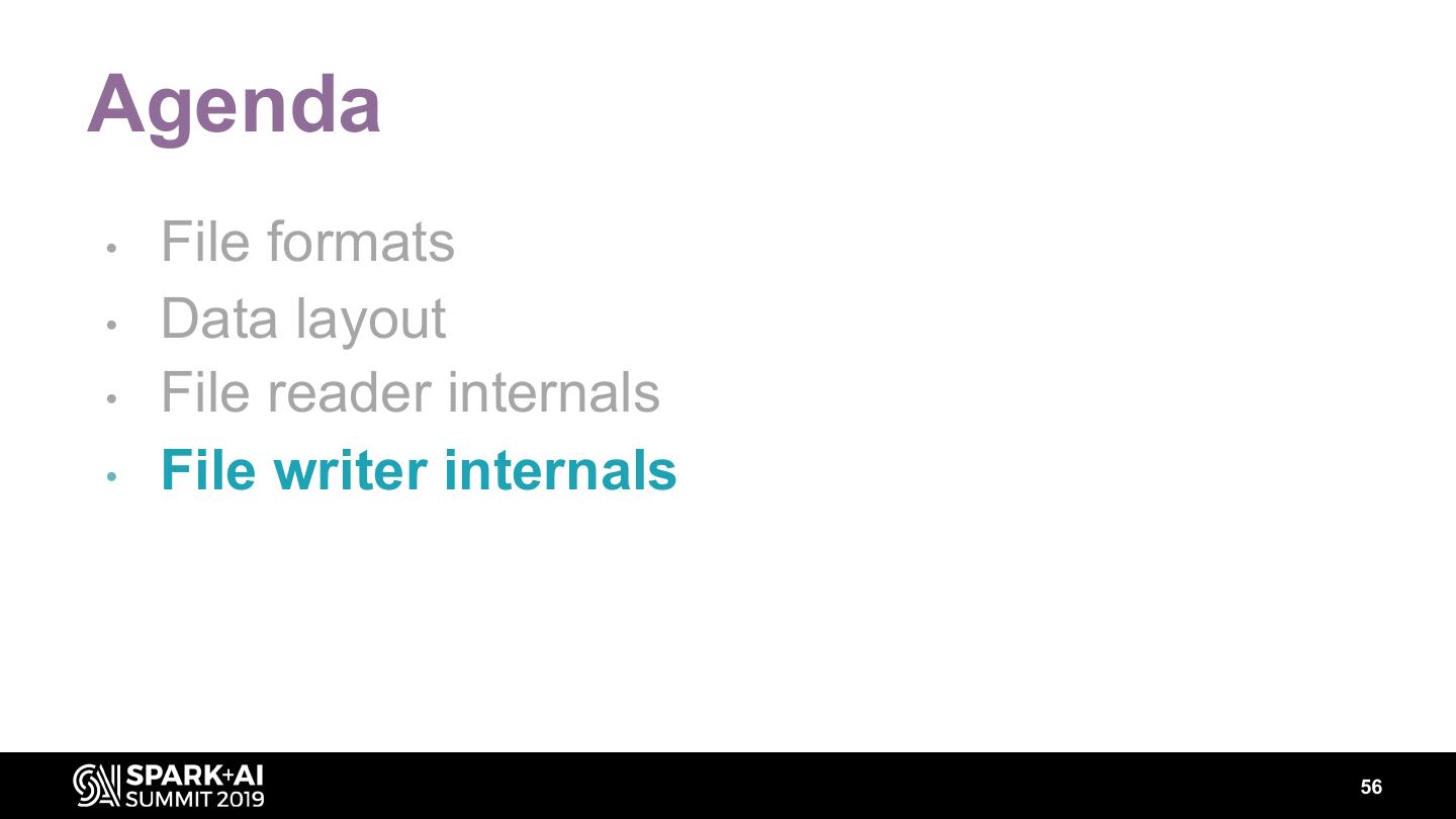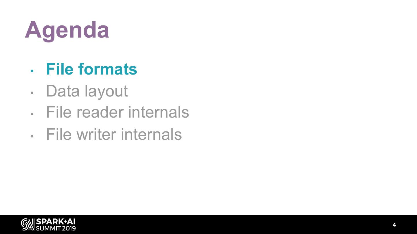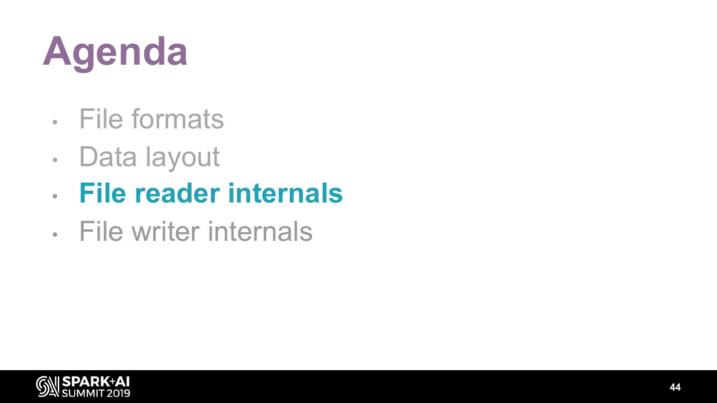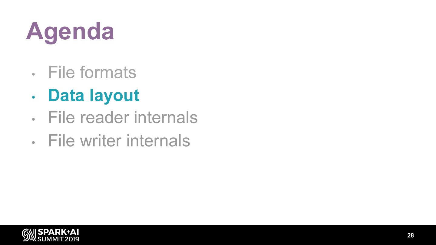 28 .Agenda • File formats • Data layout • File reader internals • File writer internals 28