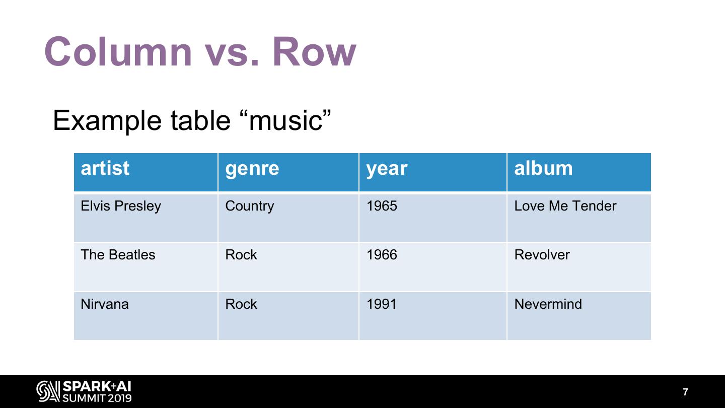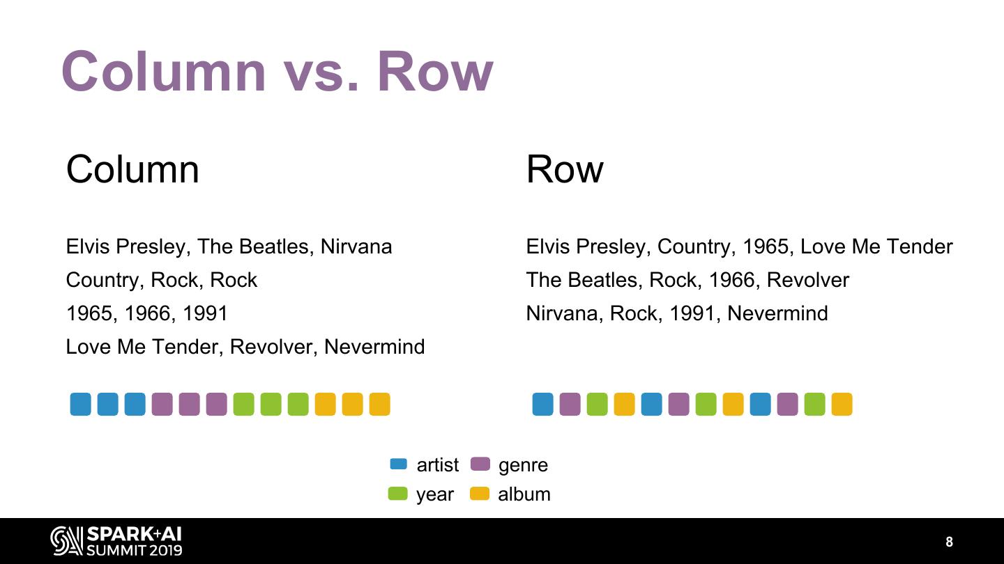 8 .Column vs. Row Column Row Elvis Presley, The Beatles, Nirvana Elvis Presley, Country, 1965, Love Me Tender Country, Rock, Rock The Beatles, Rock, 1966, Revolver 1965, 1966, 1991 Nirvana, Rock, 1991, Nevermind Love Me Tender, Revolver, Nevermind artist genre year album 8