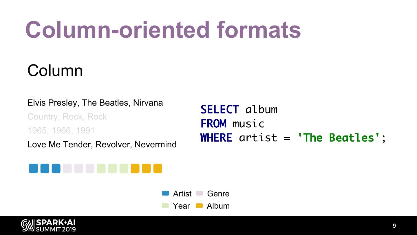 10 .Row-oriented formats Row SELECT * FROM music; Elvis Presley, Country, 1965, Love Me Tender The Beatles, Rock, 1966, Revolver Nirvana, Rock, 1991, Nevermind INSERT INTO music ... artist genre year album 10