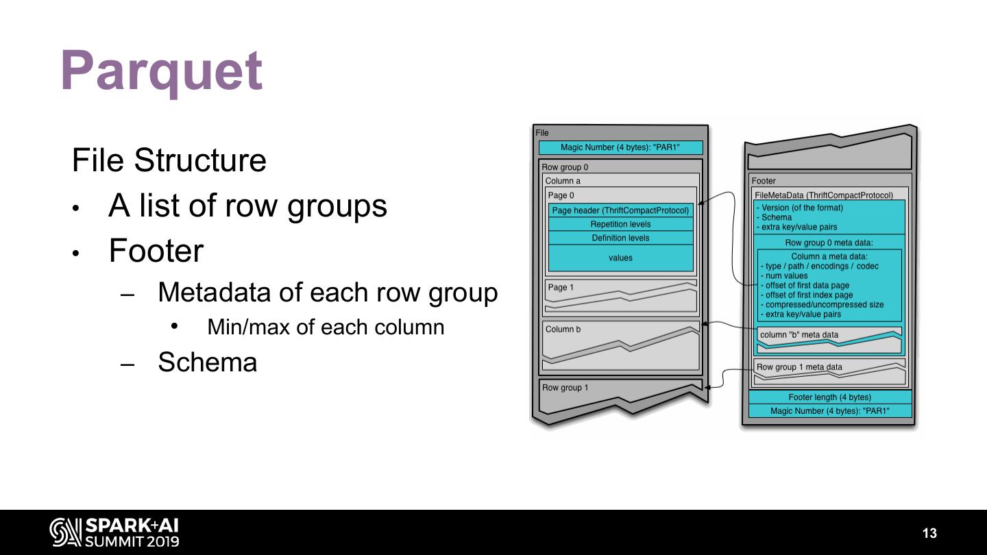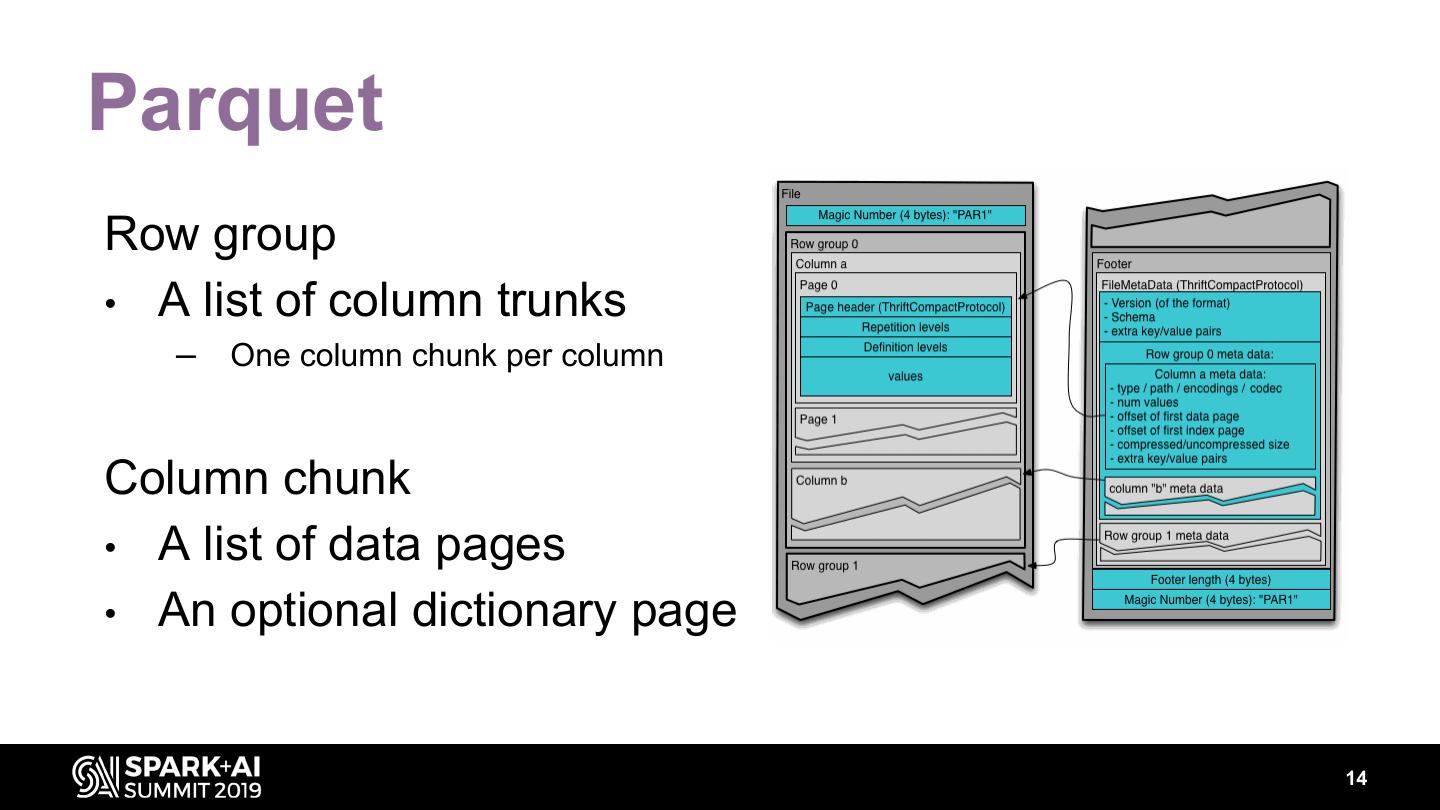 13 .Parquet File Structure • A list of row groups • Footer – Metadata of each row group • Min/max of each column – Schema 13
