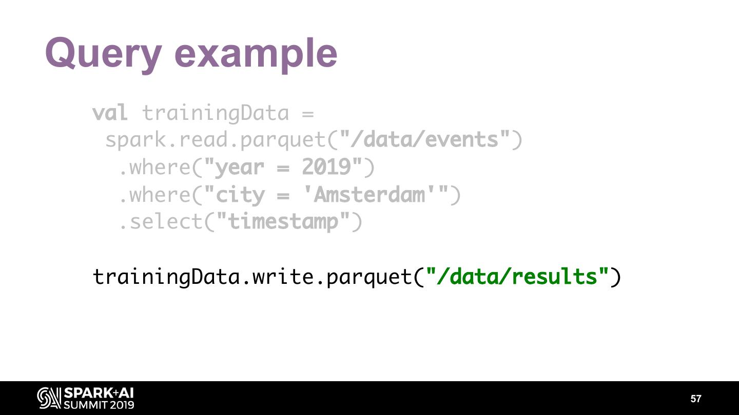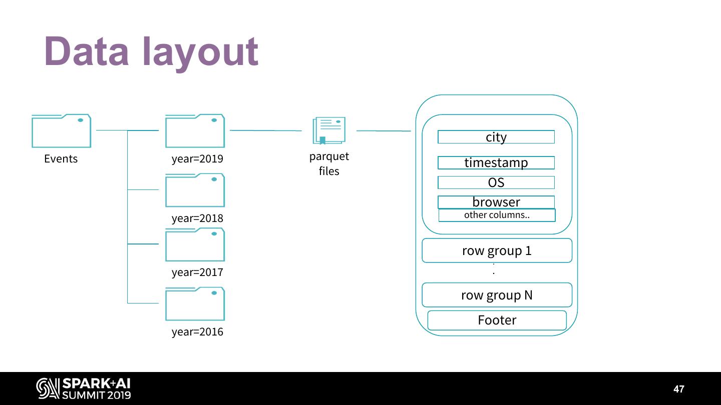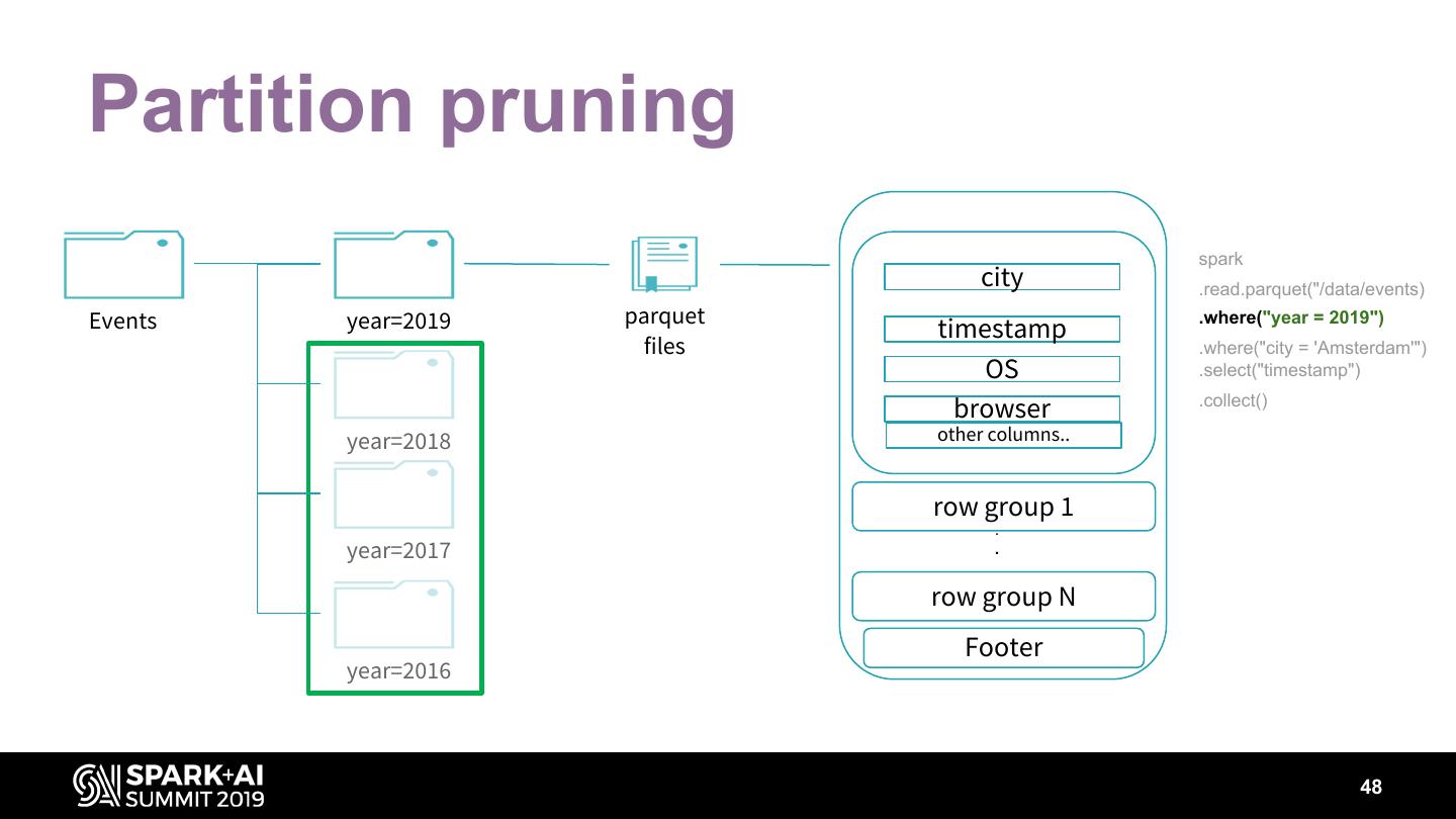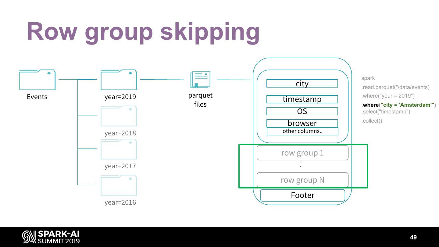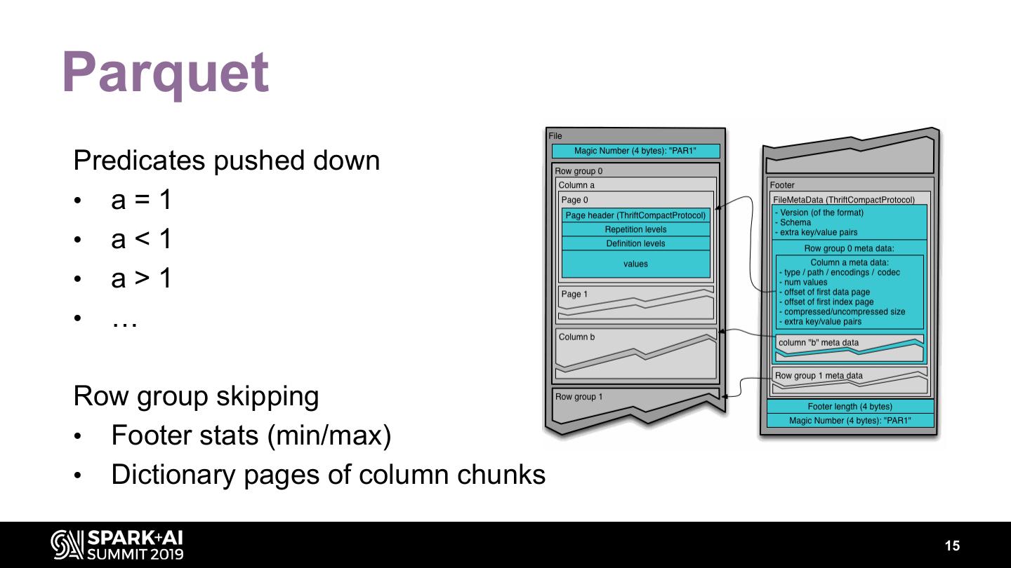 15 .Parquet Predicates pushed down • a=1 • a<1 • a>1 • … Row group skipping • Footer stats (min/max) • Dictionary pages of column chunks 15