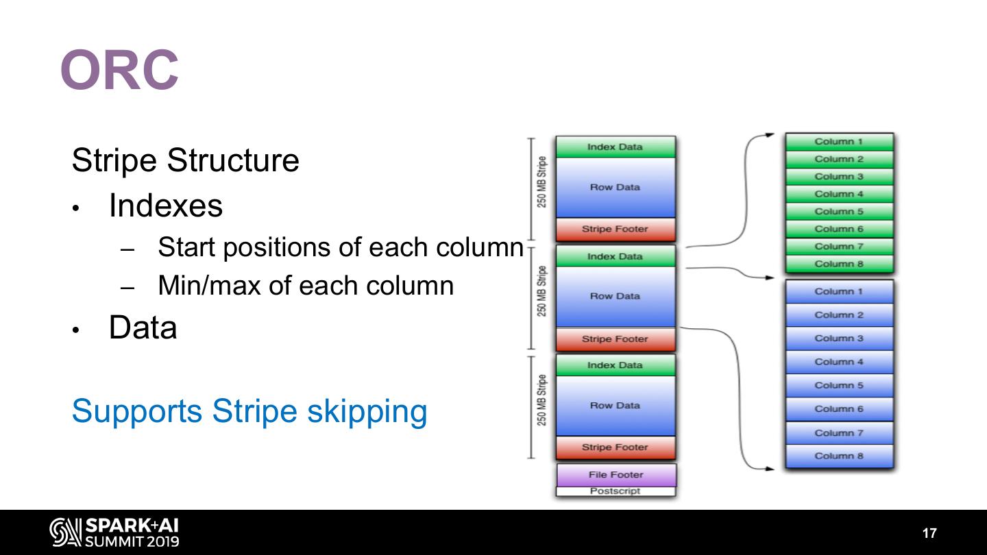 16 .ORC File Structure • A list of stripes • Footer – column-level aggregates count, min, max, and sum – The number of rows per stripe 16